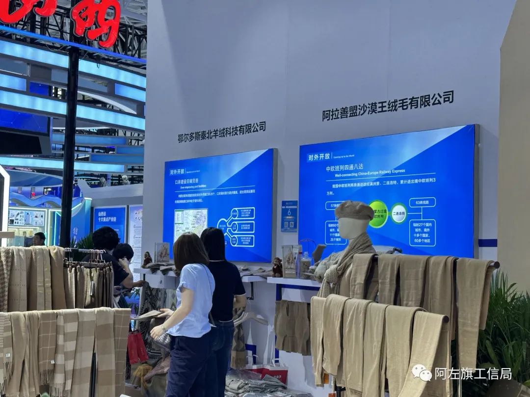 2023年9月21日,为期4天的第六届中国—阿拉伯国家博览会在宁夏银川开幕。本届中阿博览会以“携手新时代、抢抓新机遇、共享新未来”为主题,阿左旗工信局组织辖内阿拉善盟沙漠王绒毛有限公司和内蒙古沙漠驼妈妈实业有限公司两家企业参与了此次盛会。