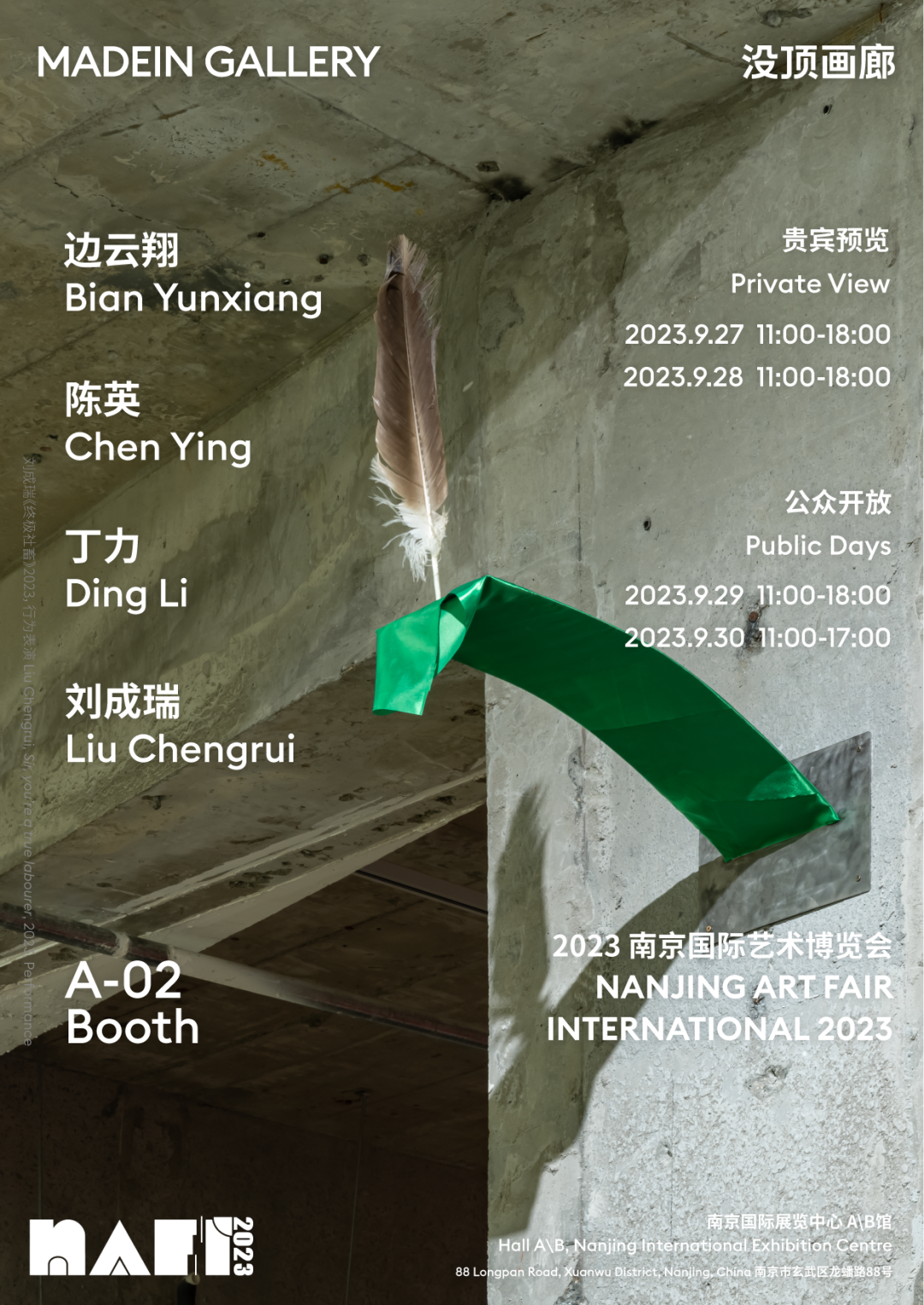 2023.9.27-9.28 11:00-18:00Hall A\B, Nanjing lnternational Exhibition Centre88 Longpan Road, Xuanwu District, Nanjing没顶画廊将于2023年南京国际艺术博览会A02展位呈现边云翔、陈英、丁力和刘成瑞的绘画、摄影及影像作品。MadeIn Gallery is pleased to present a selection of paintings, photography and video works by artists Bian Yunxiang, Chen Ying, Ding Li and Liu Chengrui at NANJING ART FAIR INTERNATIONAL 2023.
