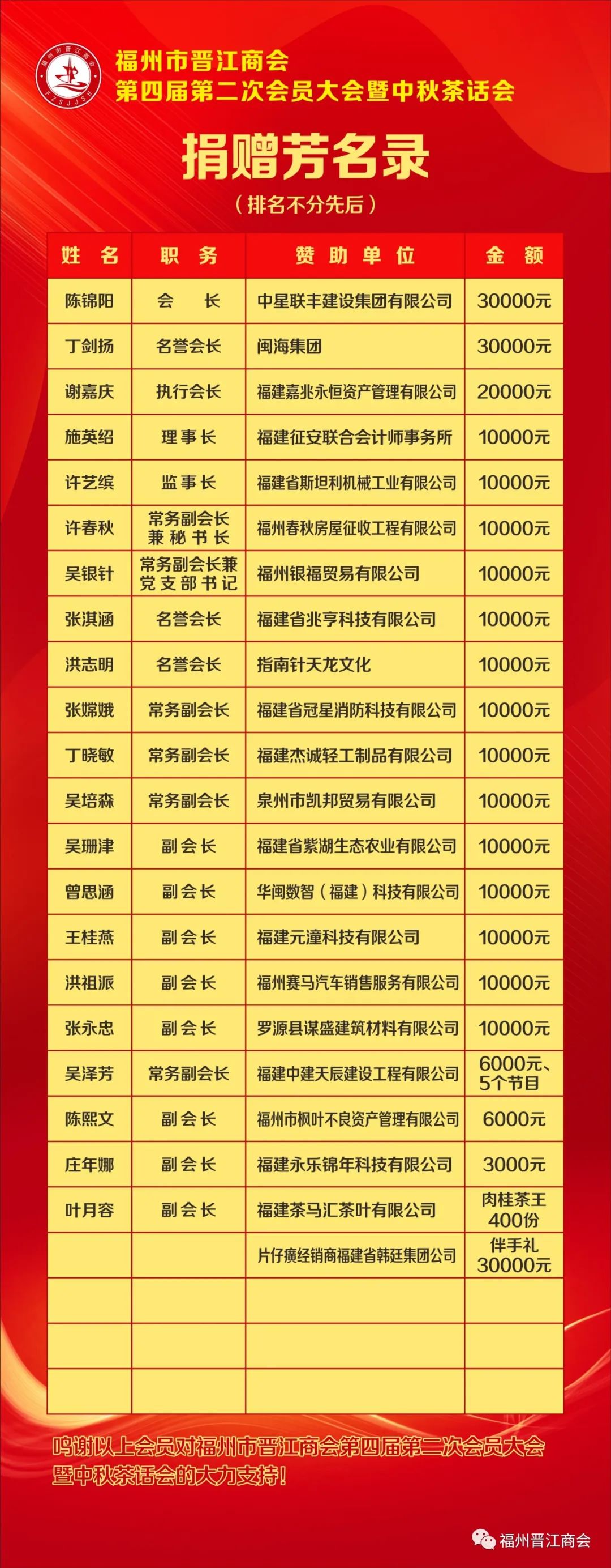 这次活动,我们要向赞助此次活动的企业表达最诚挚的感谢,正是有了他们的大力支持,我们才得以欢聚一堂,共同分享这个承载着思念与愿景的美丽中秋佳节。同时,也进一步加强商会会员之间的沟通和交流,吸引更多的企业加入商会大家庭,为商会的健康发展打下坚实的基础。在中秋节即将到来之际,商会衷心祝愿全体会员:节日快乐!身体健康!阖家幸福!