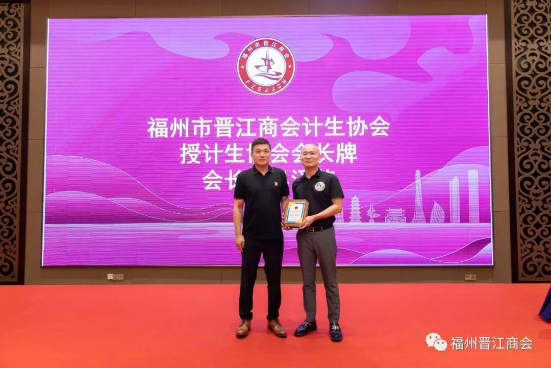 (商会执行会长谢嘉庆为第二届计生协会会长吴泽芳授牌)
