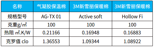 从以上实测数据可知:相同克重下气凝胶保温棉的热阻、克罗值相对3M新雪丽保暖棉较高,保暖效果较3M新雪丽好。