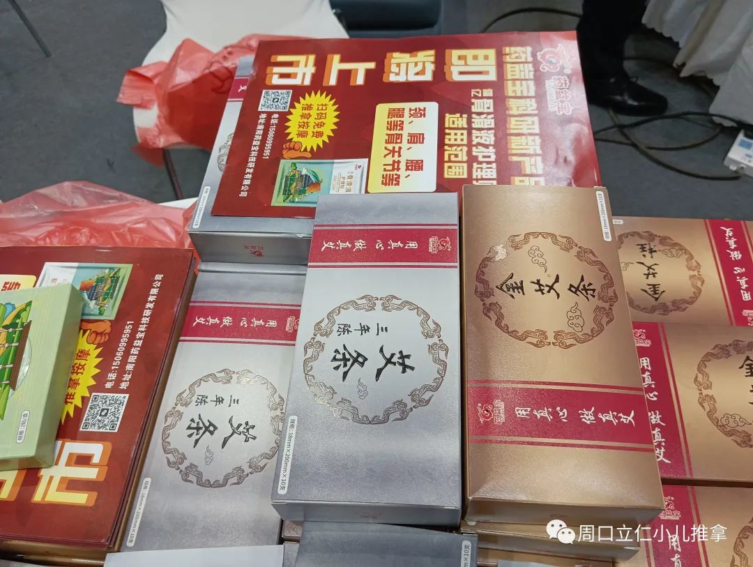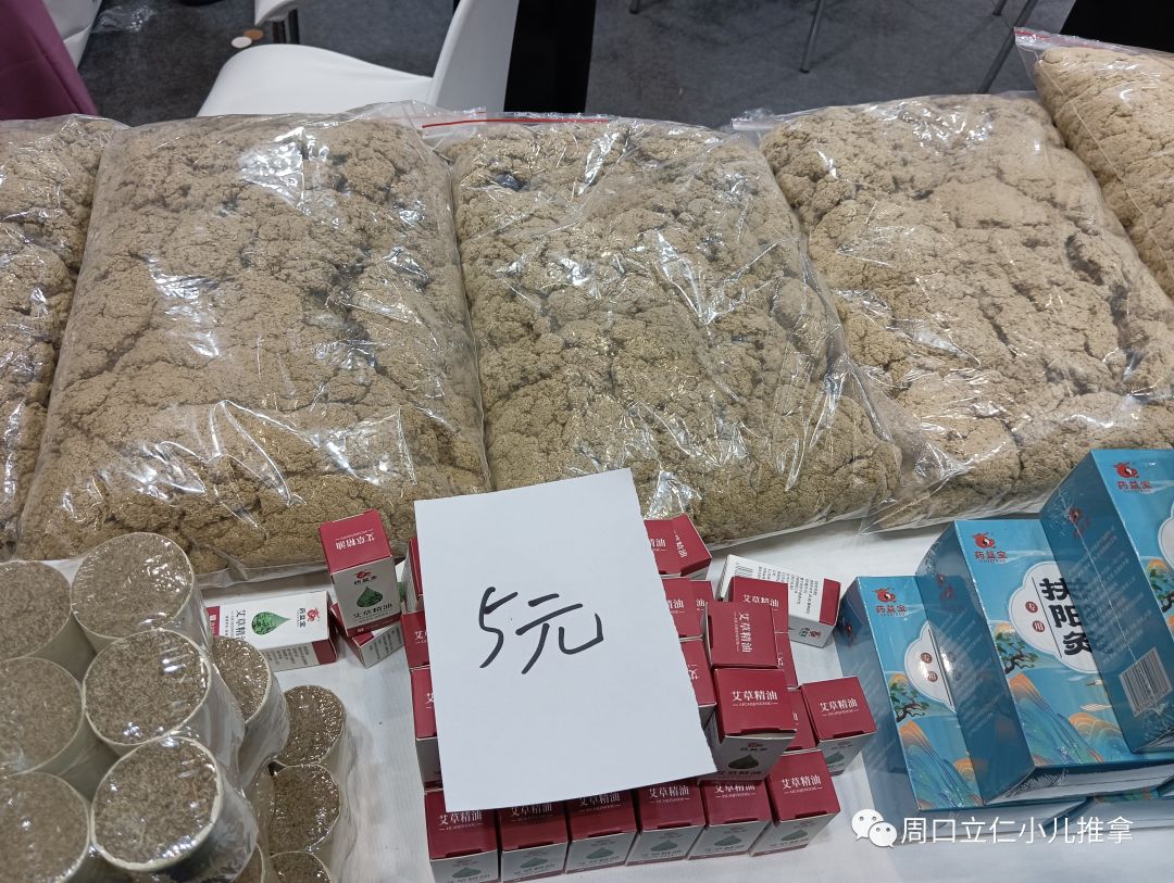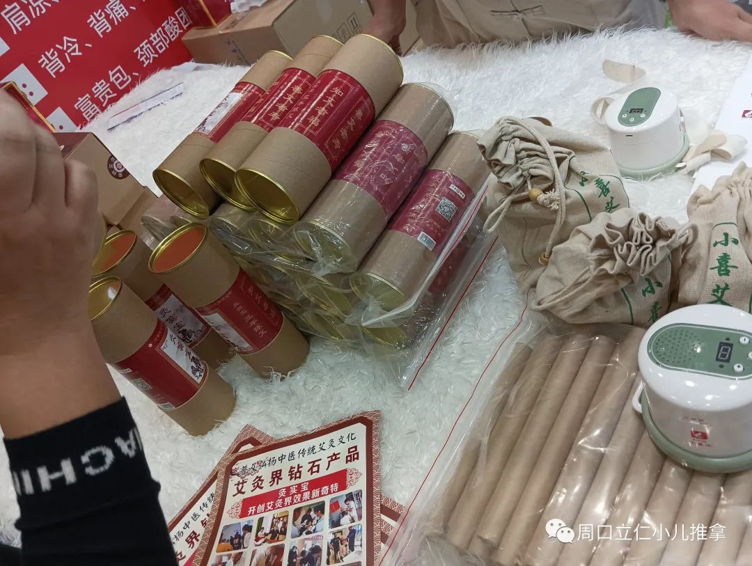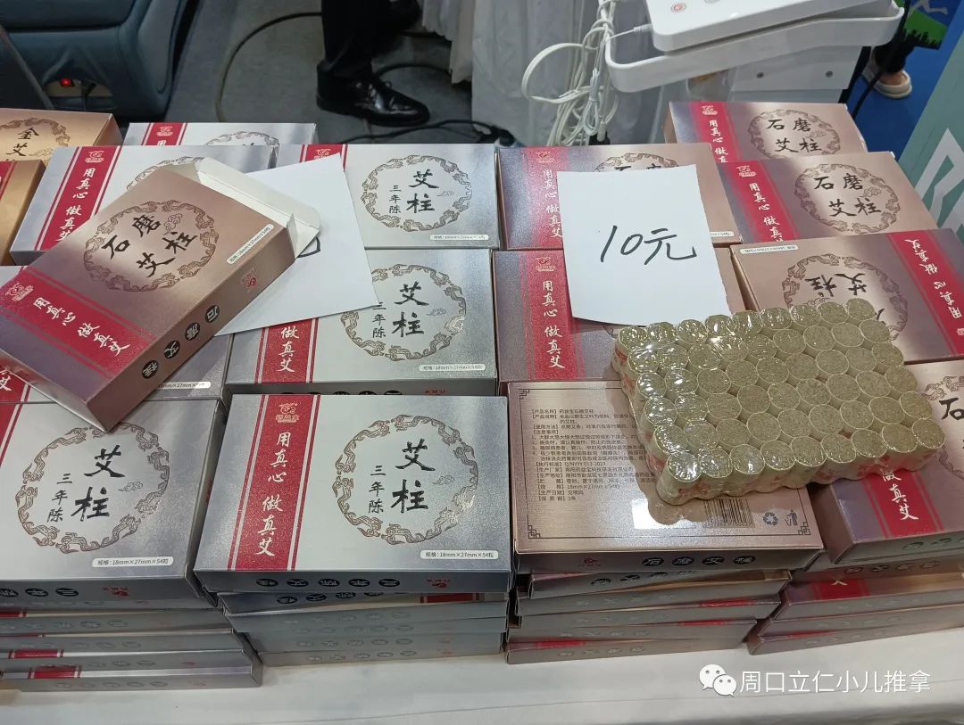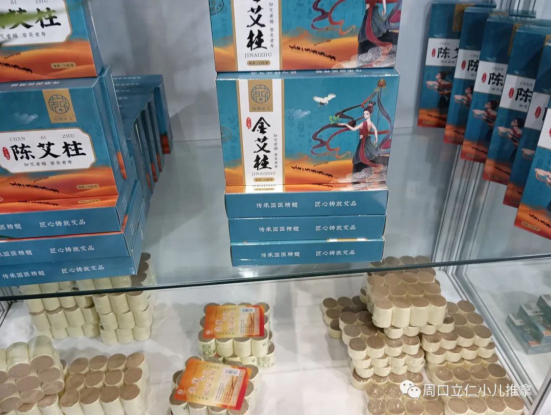 现场产品基本上还是以各种规格的艾条,艾绒,相关艾灸盒,器具为主,也有各类贴剂,膏剂。因为没啥技术门槛,要想把这些产品做出差异很难。同质化明显,包装盒一拆,往那一放,区别不大。