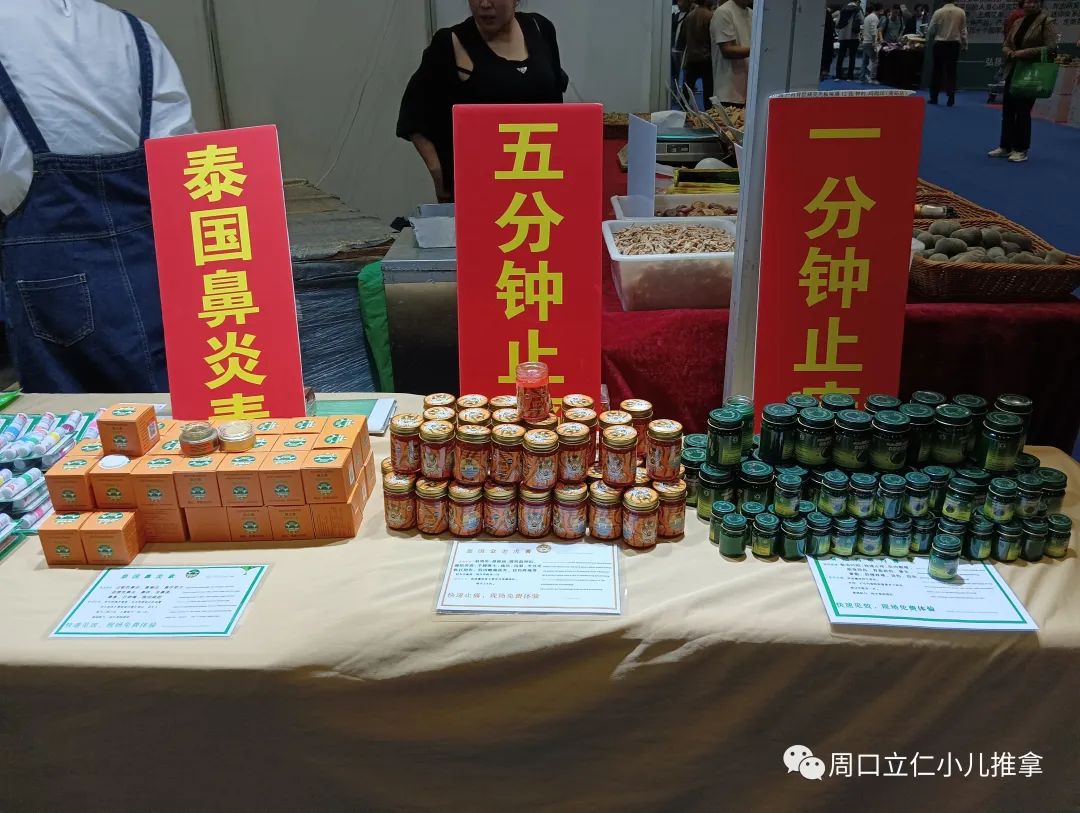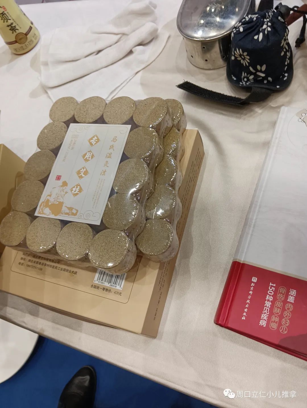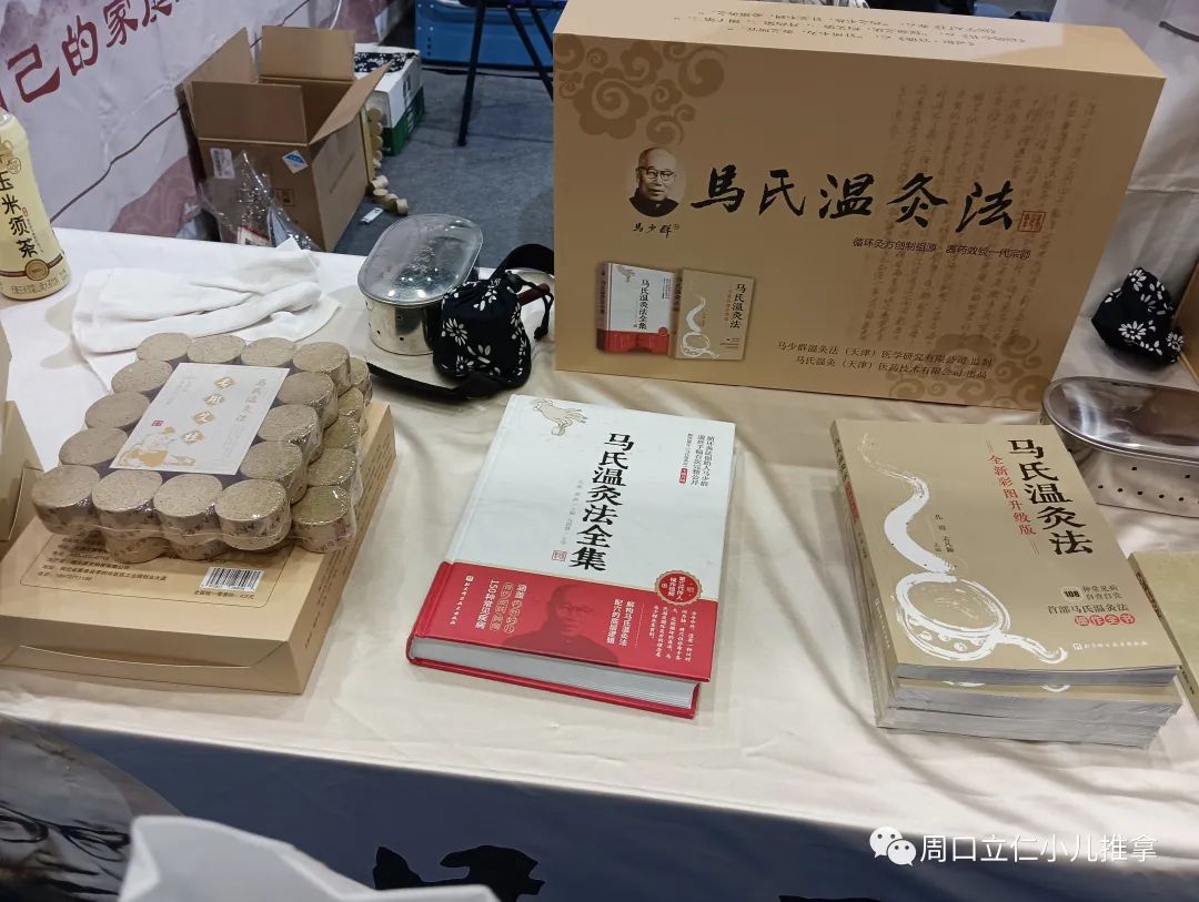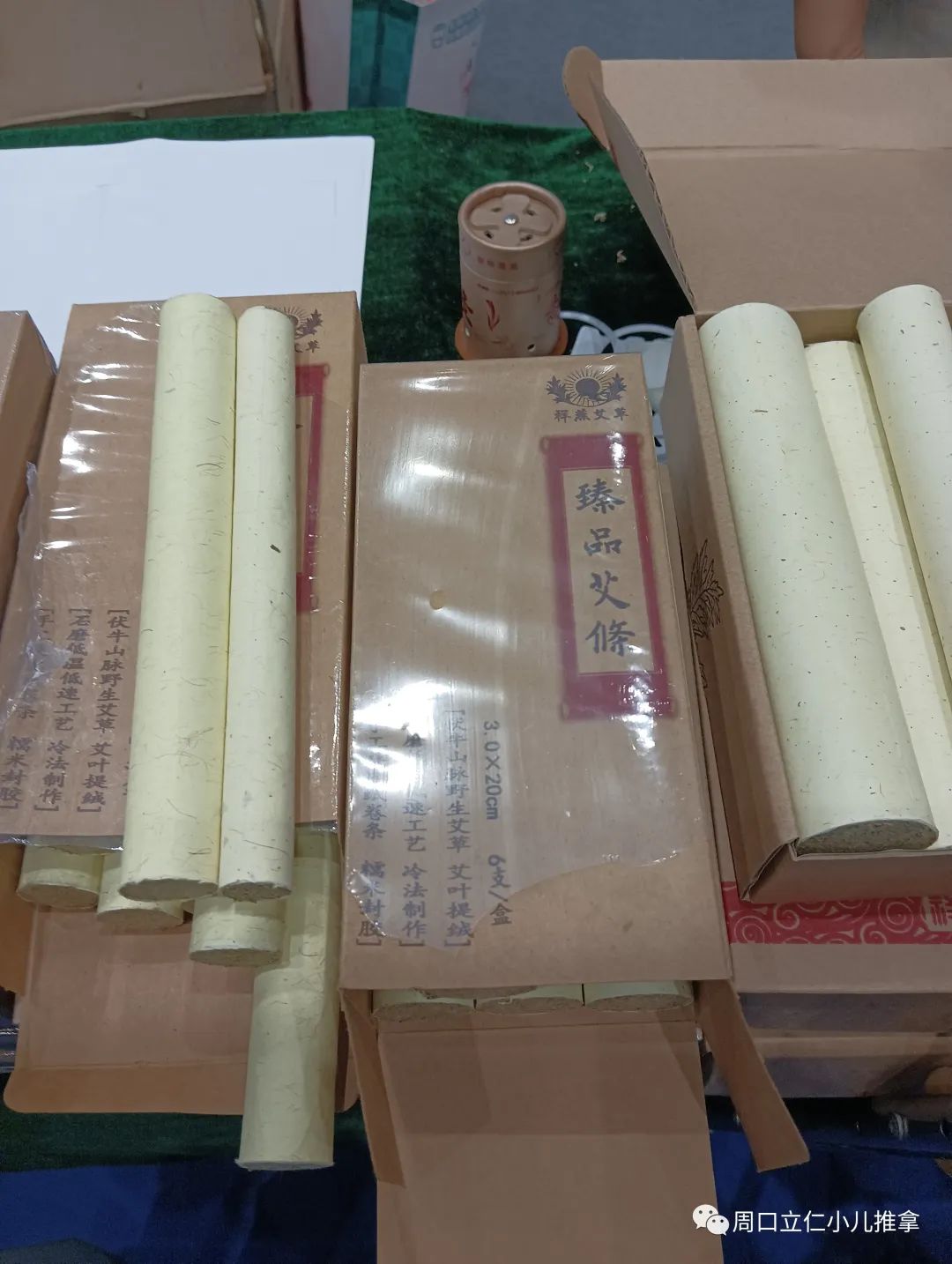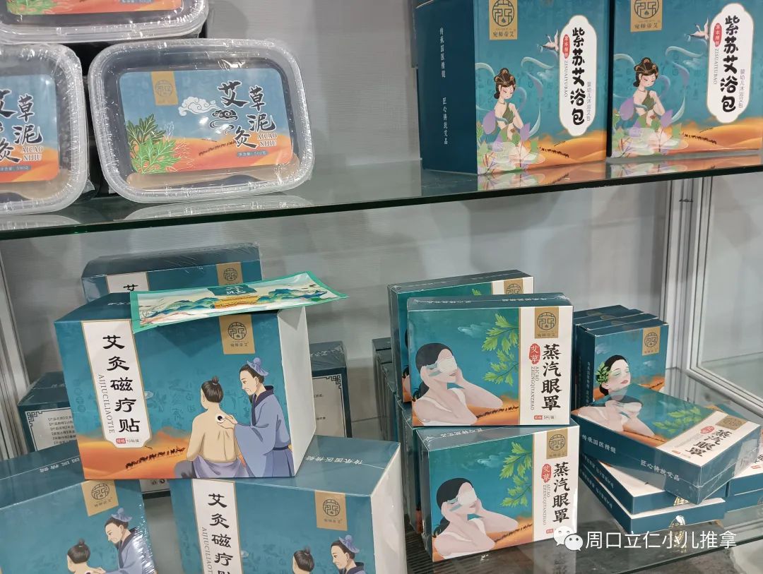 现场产品基本上还是以各种规格的艾条,艾绒,相关艾灸盒,器具为主,也有各类贴剂,膏剂。因为没啥技术门槛,要想把这些产品做出差异很难。同质化明显,包装盒一拆,往那一放,区别不大。