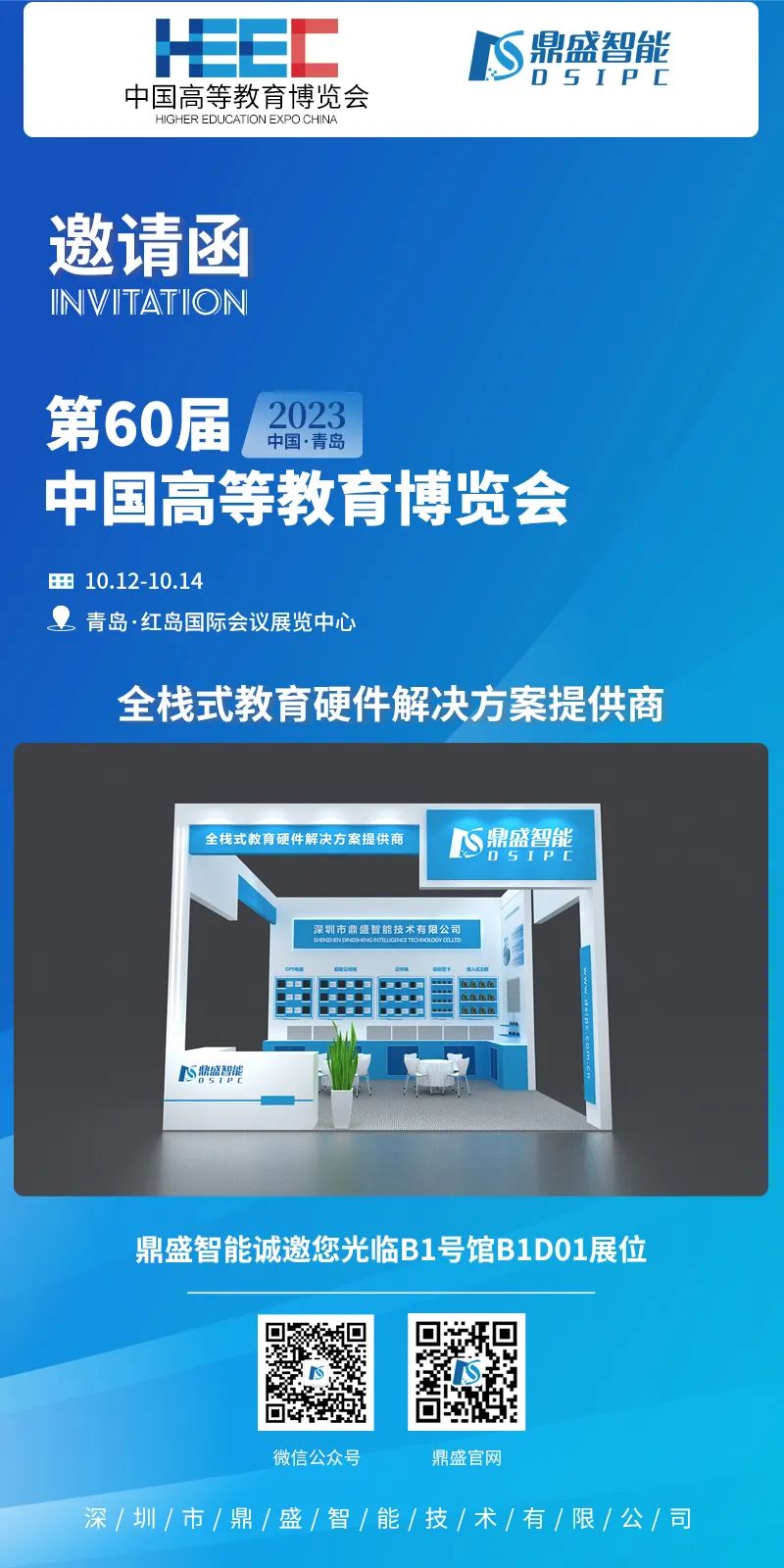 第60届中国高等教育博览会将于10月12日-14日将在青岛•红岛国际会议展览中心举办,鼎盛智能将携全栈式教育硬件解决方案参展(展位:B1馆B1D01),在此诚邀各位拨冗莅临!