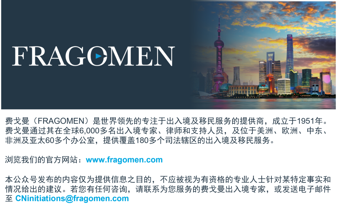 The collaboration between these two industry forums was an excellent opportunity to share and exchange insights on popular topics in both industries. We look forward to continuing to contribute in future collaborations. 这两个行业论坛之间的合作是一次绝佳的机会,供业内人士就行业热点话题进行分享和交流见解。我们期待在未来的合作中继续做出贡献。 About Fragomen Fragomen Group is dedicated to immigration services worldwide. Fragomen Group has 6,000 immigration professionals and support staff in more than 60 offices across the Americas, EMEA and Asia Pacific, and offers immigration support in more than 170 countries. Fragomen’s professionals are respected leaders in the immigration field, and Fragomen Group is regularly recognized as a leading employer of minority and female attorneys and advisors. Fragomen in China is Fragomen (Shanghai) Co. Ltd., operating exclusively as an immigration consultancy and not as a law firm in China. 关于费戈曼费戈曼集团(简称“费戈曼”)致力于全球出入境服务。 费戈曼在美洲、欧洲、中东、非洲和亚太地区拥有60多个办公室,及6,000名出入境专业人士和支持人员,并在170多个国家/地区提供出入境支持。费戈曼的专业人士是出入境领域备受尊敬的领军人。费戈曼经常被认可为少数族裔和女性律师和顾问的领先雇主。费戈曼在中国是费戈曼商务咨询(上海)有限公司,在中国专门从事出入境咨询业务,而非律师事务所。 如欲了解全球出入境动态及我们的专业解读,点击关注费戈曼FRAGOMEN公众号: