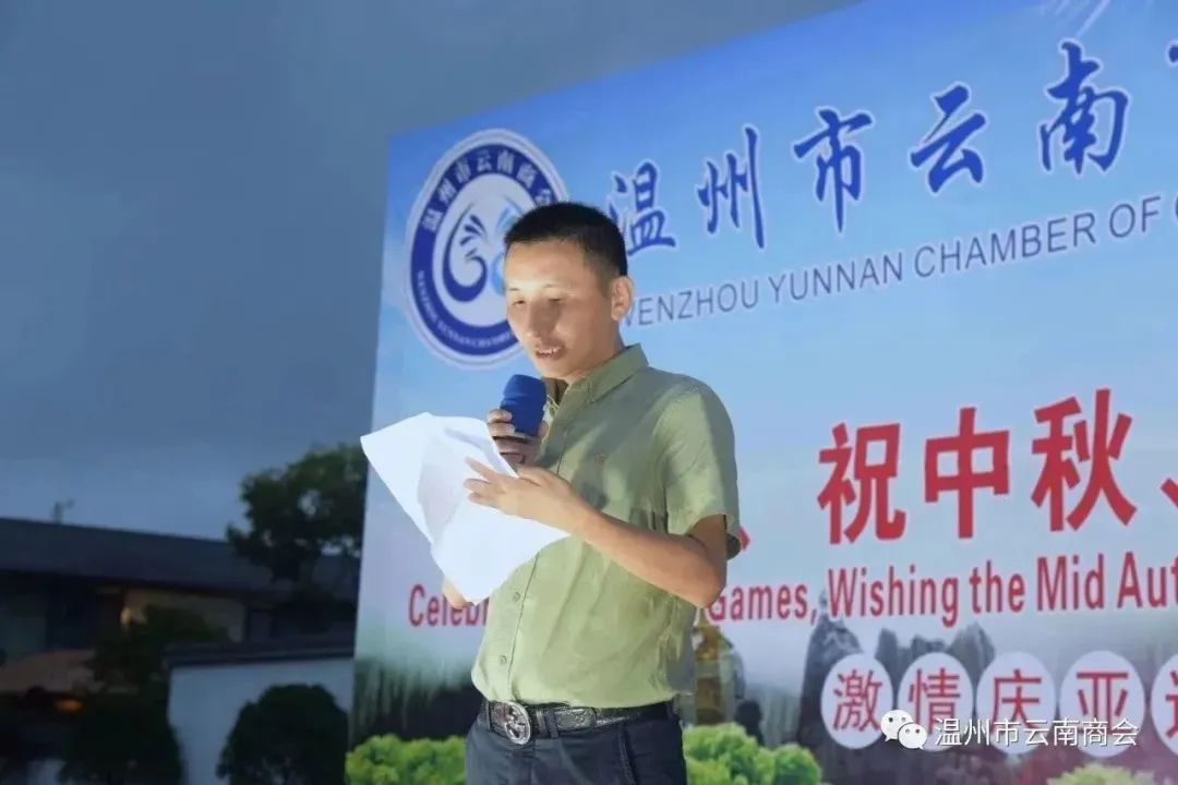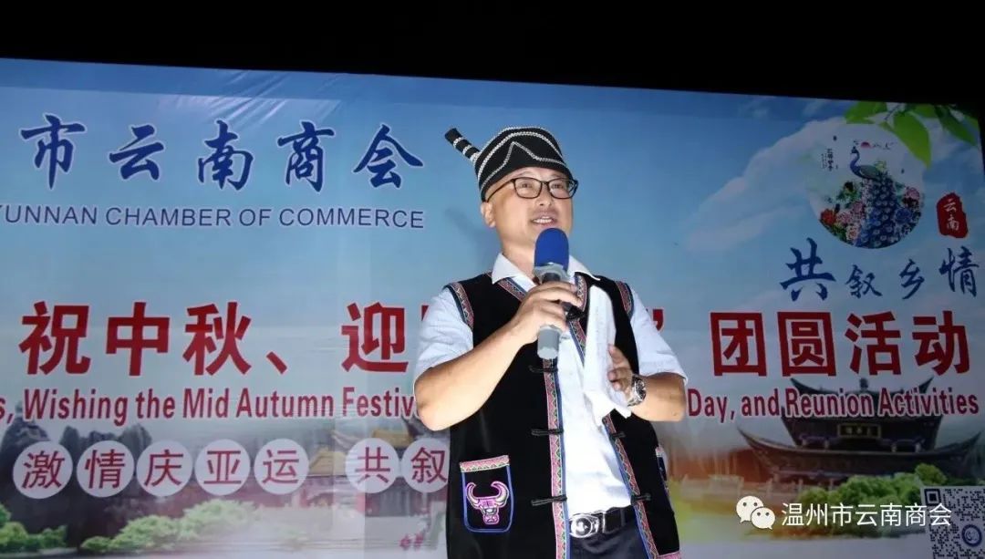 商会会长宗碧致辞,他代表温州市云南商会向关心支持商会发展的各位领导、各界朋友和全体会员及家人朋友们表示衷心的祝福和诚挚的问候!感谢大家对商会工作的大力支持!云南商会以乡情为纽带,在平等尊重、开放民主、求同存异的基础上,通过信息互通、资源共享、互帮互助的形式,为广大在温同乡提供一个合作的平台。他感谢为今天活动的顺利举办付出辛苦的筹备组成员,并代表商会预祝大家节日快乐,身体健康、阖家幸福!