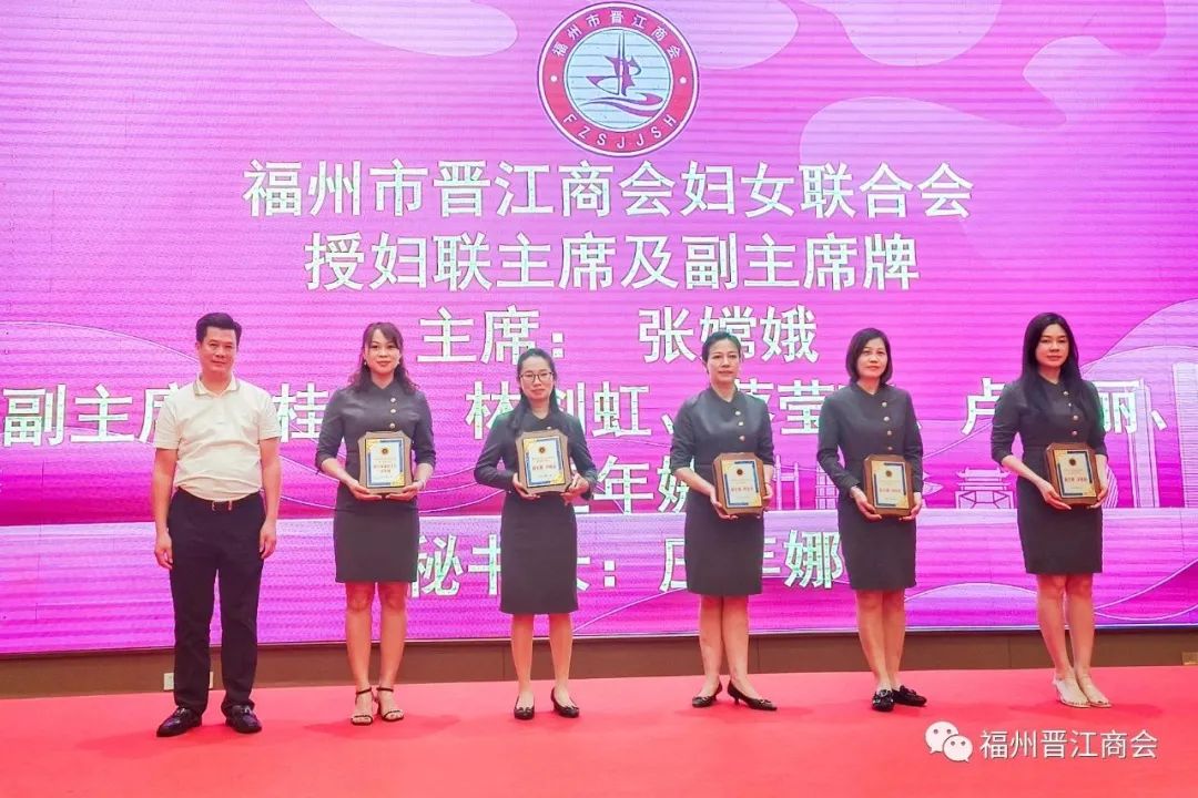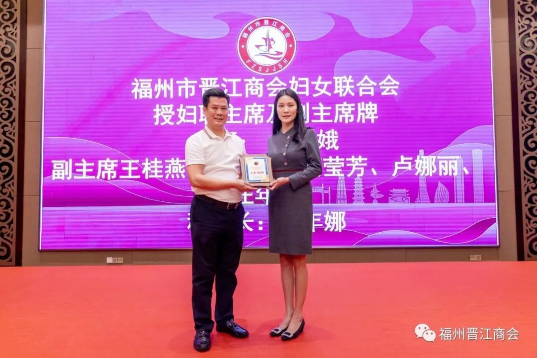 商会会长陈锦阳为第二届妇联副主席王桂燕、林剑虹、蔡莹芳、卢娜丽、庄年娜授牌