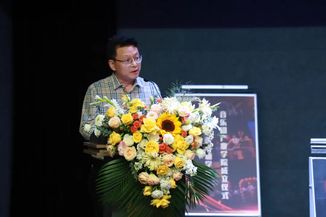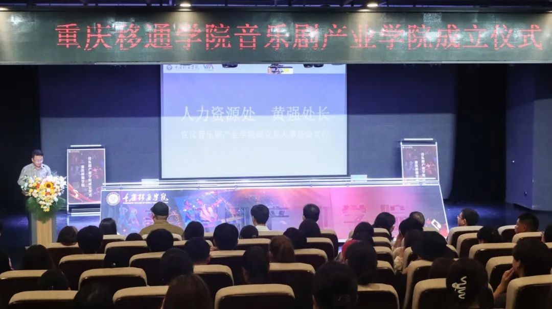 我校人事处黄强处长宣读音乐剧产业学院成立及人事任命文件,宣布邹贤达兼任音乐剧产业学院首任院长。