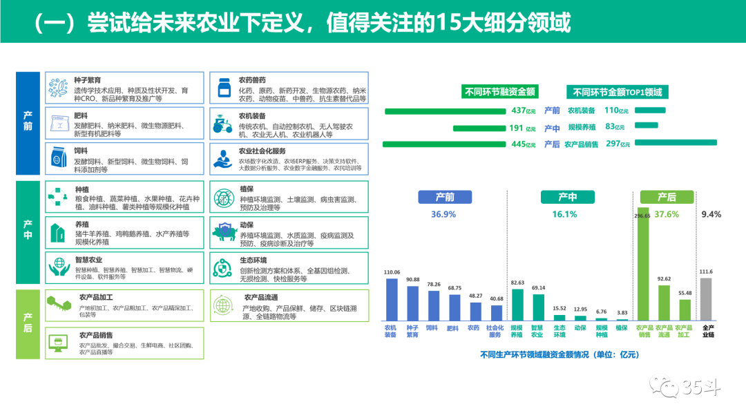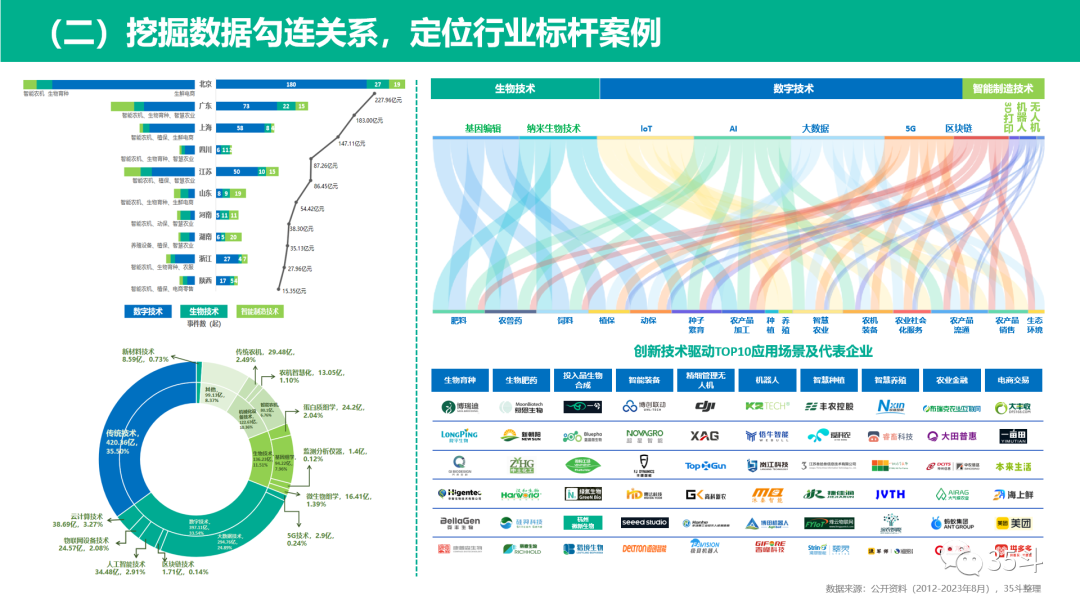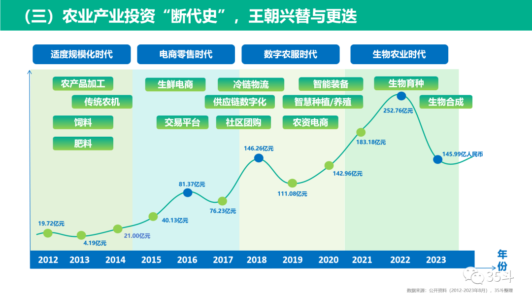 按照投融资金额筛选出TOP10的地区,并将这些地区的融资事件按照国家创新发展战略的核心技术进行分类,可以看出数字技术、生物技术和智能制造技术在推动农业产业发展中起到关键作用,并且在不同地区,依托不同的技术形成了地区间的产业优势,为投资机构招标的、招商部门引企业,提供了一定的参考依据。同时,技术的创新推动不同细分赛道发展,数字技术、生物技术和智能制造技术逐渐趋于全产业链的覆盖,已经有多个应用场景凸显其产业驱动价值,如生物育种、投入品生物合成、农业机器人、精准管理无人机等。以2012年至2023年8月的不同年份投融资金额为基线,以3年为间隔期,将十年间的投融资划分成了4个不同的阶段,综合评估融资及产业情况,我们给每个阶段打上了属于时代的标签。2012-2014年,是“规模种养时代”,农业产业投资才刚刚起步,这个阶段,资本的属性趋于稳妥,所以主要布局在农产品加工、传统农机、肥料、饲料领域,项目数和金额都较少。2015-2017年,是“电商零售时代”,农产品上行是核心推动力量,大批量的生鲜电商诞生,资本开始纷纷入局,因此也出现了这个阶段的第一个投资浪潮。2018-2020年,在大量的生鲜电商诞生后,为了满足线上销售,提高生产和流通效率,产业进入了“数字化农服时代”。一方面,针对“最后一公里”问题,冷链物流、供应链数字化以及社区团购热点频发;另一方面,为了达到标准化、提高生产效率,在农产品生产端逐渐嵌入数字化工具和方法,带动了智慧种养殖、智能装备的繁荣。2021-2023年,随着生物技术的不断成熟,以及一大批科研人员、大企高管开始转型,推动农业进入“生物农业时代”,如转基因育种、基因编辑育种、合成生物学、微生物肥料/农药、细胞培养等等。农业产业逐渐转向从分子层面了解植物、动物、微生物,进而践行大食物观。跨界融合的未来农业时代,到底是什么?值得我们共同思考,想法不尽相同,我们也有自己的分析思考。技术创新方向:基因工程技术和智能装备技术场景丰富,产业价值巨大。目前我们已经看到像基因编辑技术、无人机以及机器人技术在生物育种、新型兽药、精准管理、机器采摘等多个场景中应用,多种技术的融合已经成为一种趋势。人才发展方向:社会新农人和专业农业人才,是核心推动力。近两年,可以看到越来越多的海归、返乡人员、企业高管躬身入局农业,成为引领乡村振兴的新农人;另外还有一部分科学家下海创业,农业院校与企业联合成立实验室、创新中心,以及像西农正在筹备未来农业研究院。这些人才力量都将成为产业的推动者。产业发展方向:产业链整合和并购,成为未来农业产业一大趋势。越来越多的农业企业沿供应链实现垂直整合,比如茅台上游布局种子,肉类食品厂开始自己养猪。企业的整合不光是利润的攫取,也是供应链的优化和调整策略。这个过程中就伴随着并购与整合,农业并购潮正在掀起,而农业种植类和畜牧养殖业将首先成为重点并购领域。当然,资金依然是这些变化中很重要的一个工具,是产业变化的催化剂、加速器和投票器。行业复杂,报告不免挂一漏万,希望产业人士多多互动,助我们反复锤炼、打磨,为农业产业发展找到一条最佳的通向未来的正确航线。