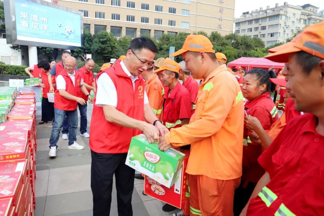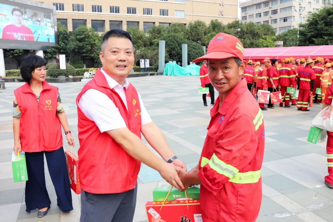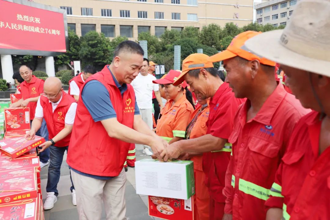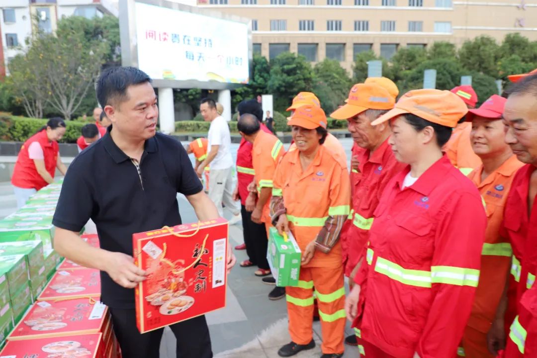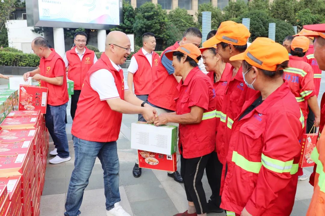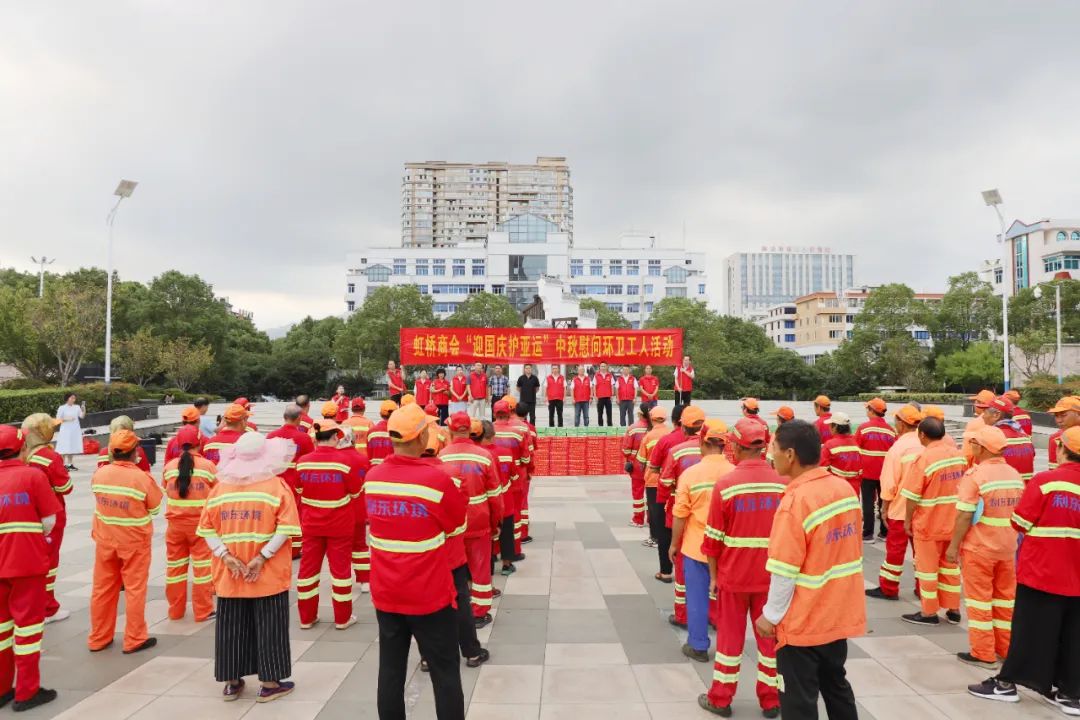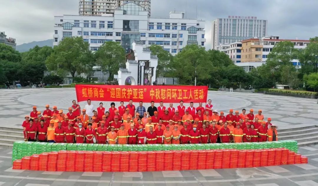 9月25日下午,在虹桥镇文化广场,,虹桥商会“喜迎国庆亚运 共度中秋佳节”慰问环卫工人活动温情满满,500箱牛奶、500箱月饼表达对环卫工人最诚挚的敬意。