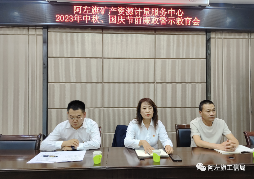 为把好节前“廉洁关”,构筑廉洁“防火墙”,持续深化落实中央八项规定精神、纠治“四风”。9月25日,阿拉善左旗矿产资源计量服务中心召开2023年中秋、国庆节前廉政警示教育会。旗工信局党组成员、派驻工信局纪检组组长,旗工信局党组成员、副局长出席会议,中心党支部书记主持,中心机关全体干部职工、轮休人员参加。