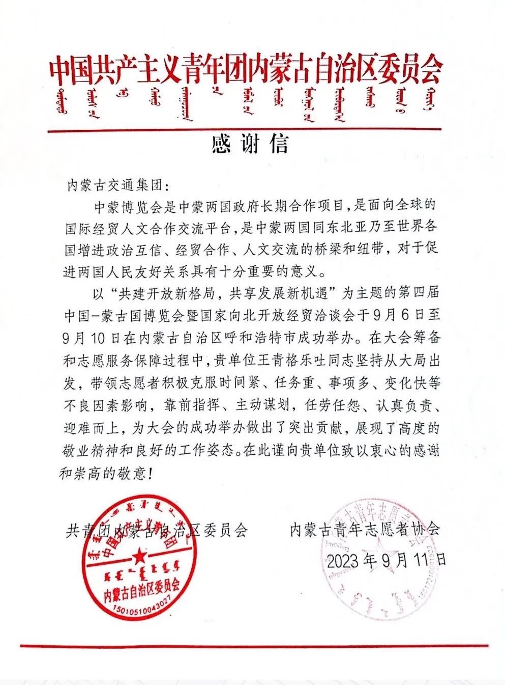 呼和浩特分公司选派的青年志愿者代表王青格乐吐参与服务了本次中蒙博览会,并收到来自共青团内蒙古自治区委员会、内蒙古青年志愿者协会的感谢信。