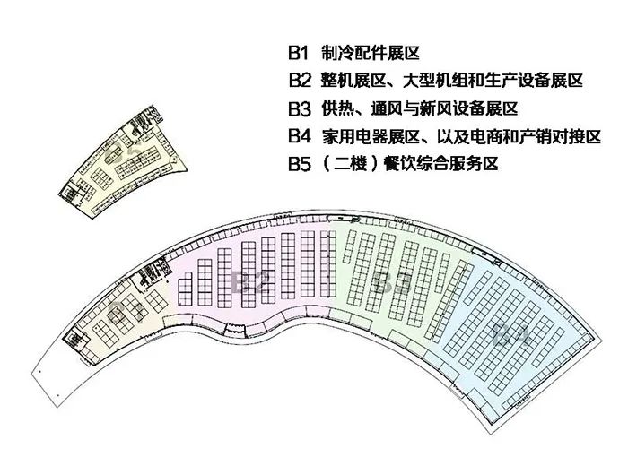 (二)B馆:B1为制冷配件展区;B2为制冷装备整机展区和大型机组、生产设备展区;B3为供热、通风与新风设备展区;B4为家用电器展区,以及电商和产销对接区;B5(二楼)为餐饮综合服务区。