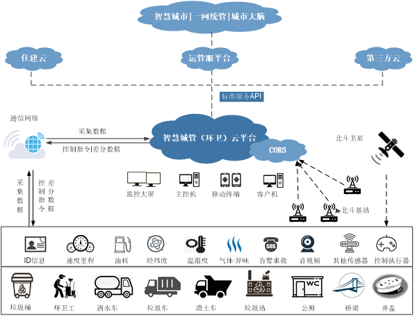 本系统由前端感知层、网络层和应用层构成。前端面向城管人员、车辆、环卫设施(垃圾桶、垃圾场站、公共厕所、渣土工地、消纳场、桥梁、井盖等)等安装部署各类感知设备,采集各种状态数据和告警数据,通过网络层(4G/5G/NB-IoT/有线)将数据上报给后台,后台应用层软件平台围绕城管环卫业务领域,涵盖了道路清扫保洁、垃圾清运处置、公厕卫生保洁、渣土运输监管、市政桥隧安全、市政地下管网监测、综合执法音视频系统等多个子系统,构建了一体化的信息化系统,并可与第三方上级平台数据对接,助力智慧城管信息化建设。