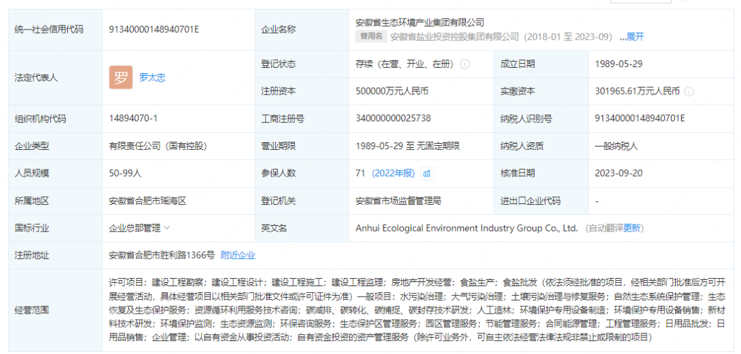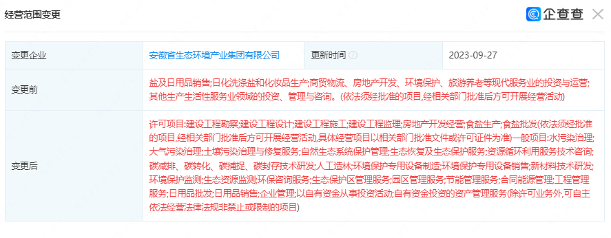 而企查查显示,日前,安徽省生态环境产业集团有限公司已经完成更名。多项工商信息变更,其中,注册资本金从“301965.61万元人民币”增加到“500000万元人民币”,营业范围也发生较大调整。安徽省生态环境产业集团已经登场。
