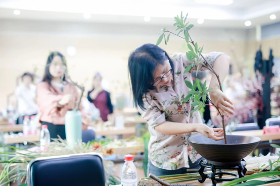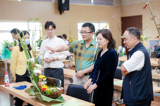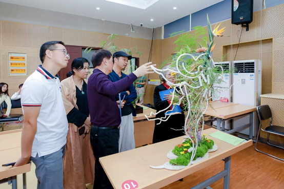 参赛者们展现出高超的技巧,有的选取竹子和菊花相结合,营造出古典之美;有的用枯木和花材打造出几何之美;还有选手运用了特殊材料如染色的花,大家纷纷为作品增添了独特的艺术魅力。