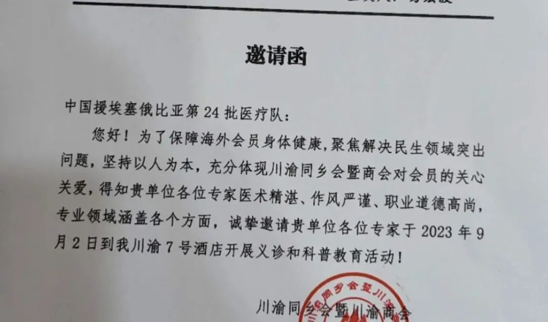 当地时间9月2日,一个休息日上午,中国援埃塞俄比亚第24批医疗队应邀赴埃塞俄比亚川渝同乡会及商会开展义诊活动。