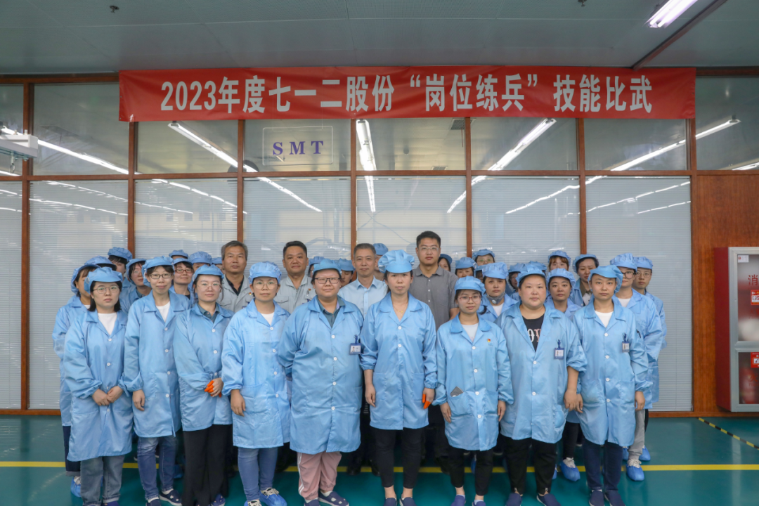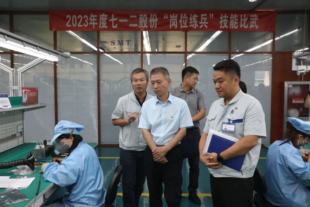 9月26日下午,七一二股份工会举办2023年“岗位练兵”手工电装技能比武大赛。中环信息产业集团工会主席李东升莅临现场参观指导,七一二股份工会主席王科、装备制造部部长张利祥陪同参观,来自七一二股份、七一二移动公司、振海公司的35名一线职工参加比赛。