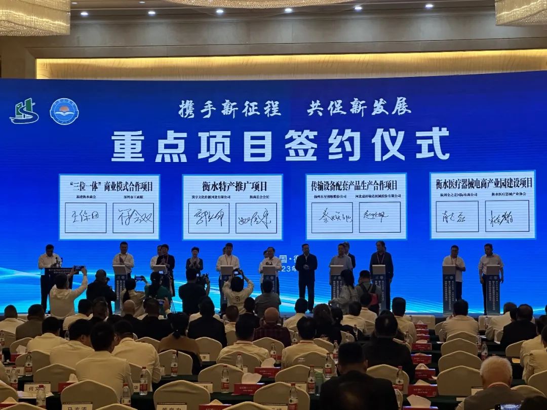 会上,衡水市商务局负责同志就衡水投资环境作了推介说明,衡水市发改委负责同志进行重点项目推介。衡商总会与冀享文化传播公司合作的衡水特产推广、冀州区衡水医疗器械电商产业园建设、枣强县传输设备配套产品生产合作以及深州市“三位一体”商业模式合作等4个项目进行了现场签约。