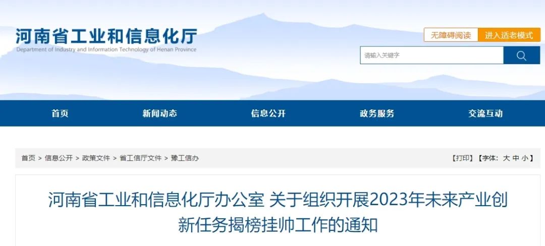 为深入贯彻落实习近平总书记关于揭榜挂帅工作的重要指示精神,加快推动未来产业创新发展,按照《工业和信息化部办公厅关于组织开展2023年未来产业创新任务揭榜挂帅工作的通知》(工信厅科函〔2023〕235号)要求,我厅决定开展2023年未来产业创新任务揭榜挂帅工作,现将有关事项通知如下: