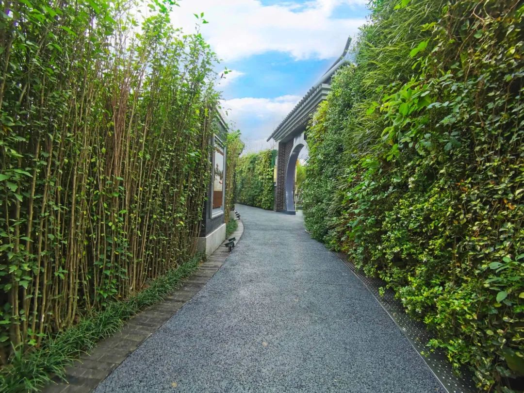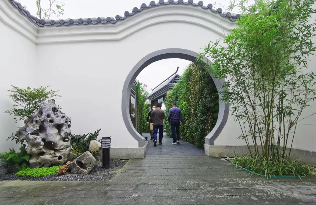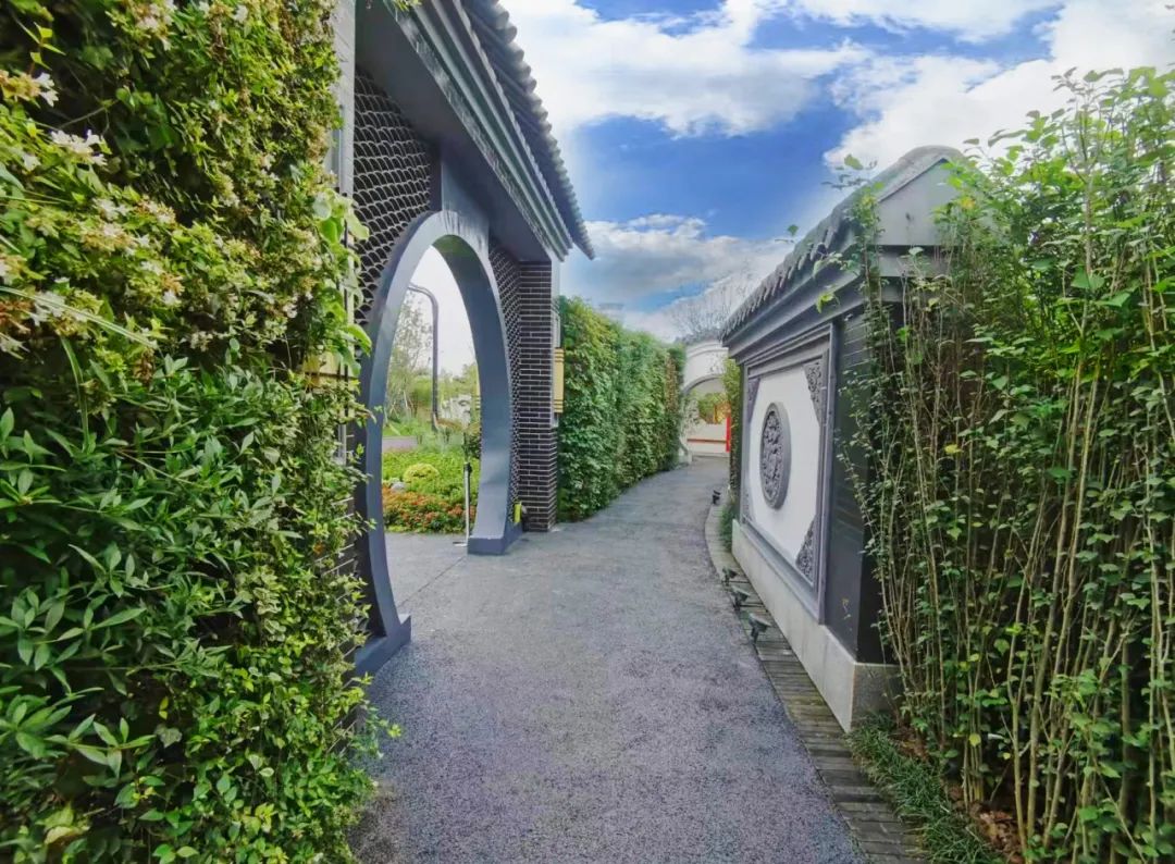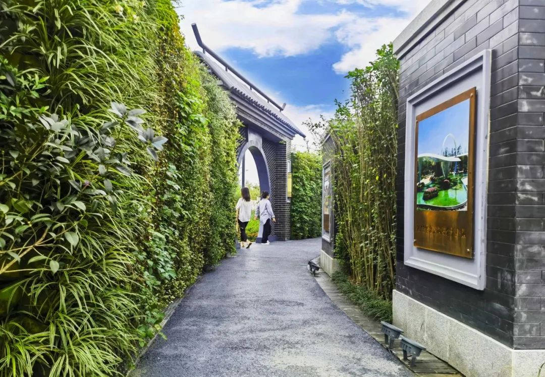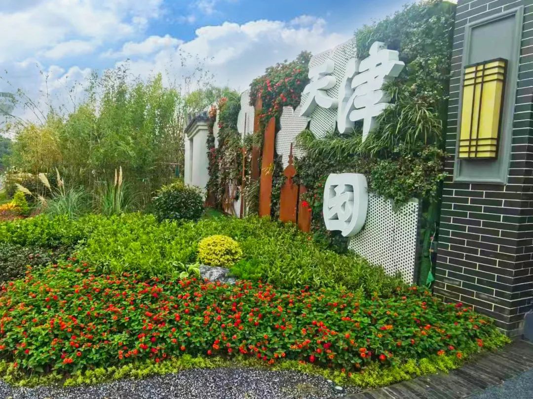 天津园入口区欲扬先抑,通过绿墙分隔空间,有序引导游人。入口景观区通过“开放之门”、“花朵剪影”、“双观影背花墙”,打造缤纷绚烂的展园入口标志,展现天津传统与现代、本土与泊来兼容荟萃的国际都市形象。