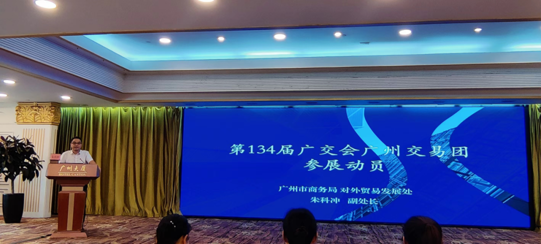 市商务局对外贸易发展处副处长、广州交易团副团长朱科冲全面介绍广州外贸发展情况,希望广交会参展企业充分利用广交会平台,抓住机遇抢订单,促外贸稳增长,助力我市外贸企业稳定健康发展。