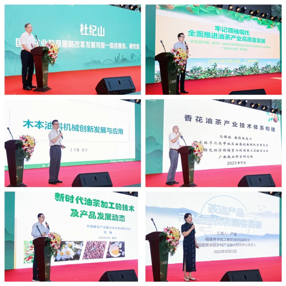 23日下午的“首届中国(柳州)油茶产业高峰论坛”在博览会主会场召开,邀请到国家林业和草原局改革发展司原一级巡视员、研究员杜纪山等六位专家,以“找行业短板、补行业短板”为角度,从一二三产就如何培育油茶市场、打造行业品牌、深化产业链、推动油茶产业高质量发展等行业热议话题展开主旨演讲。论坛现场座无虚席,反响热烈。23日晚,中国林业产业联合会木本油料分会组织参加博览会的副理事长、常务理事和有入会意向的企业参加了分会换届筹备会,并全员通过了中国林业产业联合会木本油料分会2023年一号提案。长沙市油茶产业协会整体加入中国林业产业联合会木本油料分会,为此次换届筹备会增添一抹亮色。首届中国(柳州)油茶交易博览会于25日正式落下帷幕,除广西展区、种苗展区及加工机械展区计80家参展企业外,原计划以省(市)为单位招展70家油茶加工企业。在各方大力支持下,最终有近150家企业,分成15个特装展区进行产品展销。此次博览会创下历年油茶类大型活动到会人数最多、参与展销企业最多、实际签约金额最多、展销规模最大、评比授牌最实的“五最成果”。据不完全统计,国家林业和草原局有关司局和直属单位负责人,11个油茶产区省(区、市)林业和草原主管部门负责人,广西各设区市政府分管负责人,自治区政协有关委员会负责人,自治区区直单位负责人,油茶等木本油料相关行业领域专家,相关行业协会及企业负责人等,共计800余人共同见证了这一行业历史时刻!