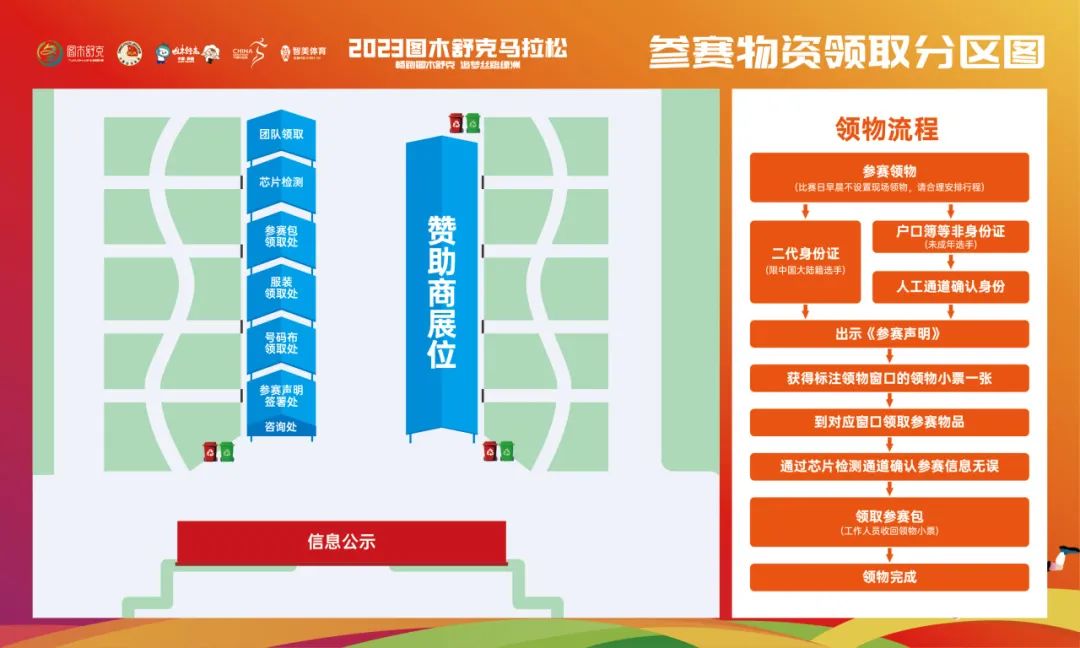 1、根据领物小票上号码布窗口号,到对应窗口领取号码布(芯片);