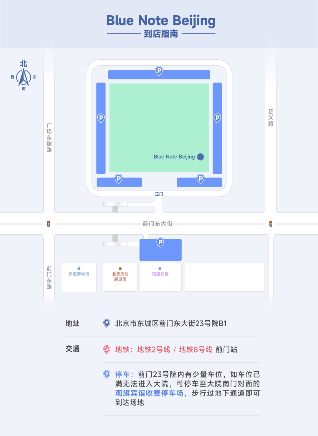 8. 开车观众可将车停至前门23号院内(车位有限,建议提前到场);如院内没有车位可将车辆停在前门东大街道路两侧市政收费车位或观旗宾馆收费停车场,步行即可到达院内。