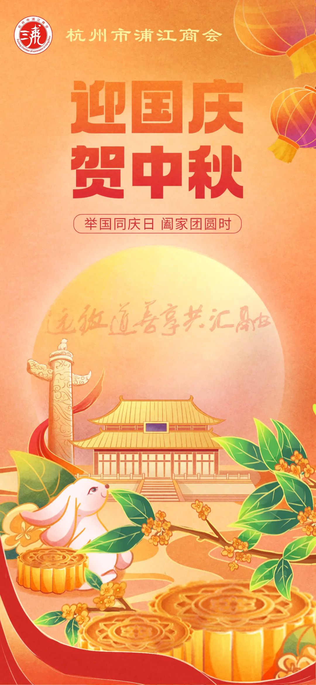 中秋国庆喜相逢,好运祝福联袂到。值此中秋、国庆双节来临之际,杭州市浦江商会会长倪良正携会长班子成员向全体会员、老乡和社会各界朋友致以节日的问候,祝大家中秋月满家圆,阖家幸福!祝福伟大的祖国繁荣昌盛,国泰民安!