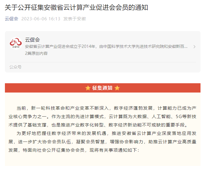 关于公开征集安徽省云计算产业促进会会员的通知