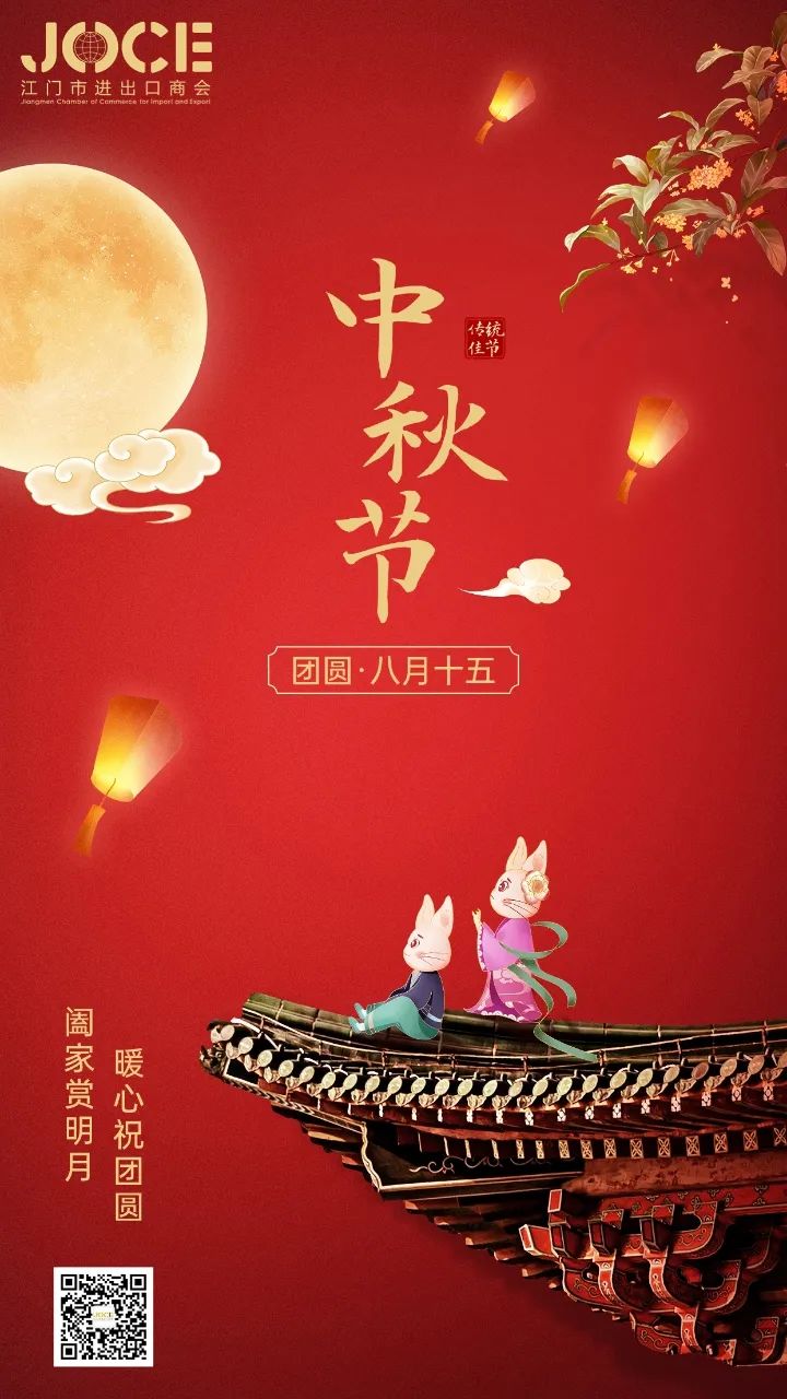 秋风起,月渐圆,一年一度的中秋节又来临。值此中秋佳节,江门市进出口商会向关心我会发展的各位领导、社会各界朋友及全体会员朋友们致以节日的问候和诚挚的感谢!向仍在坚守岗位付出辛勤劳动的从业者致以诚挚的节日问候,祝大家中秋节快乐,阖家团圆,身体健康。