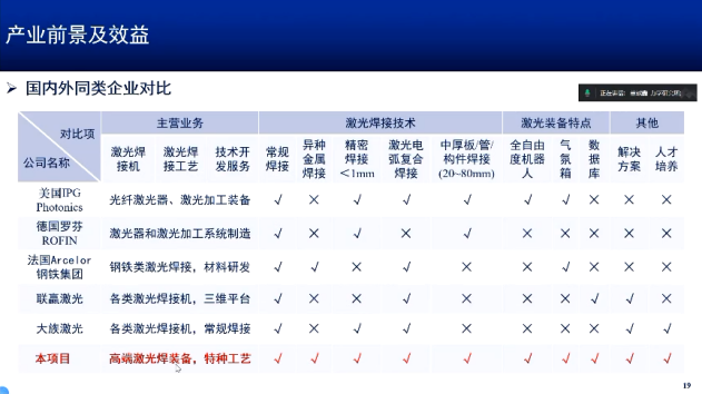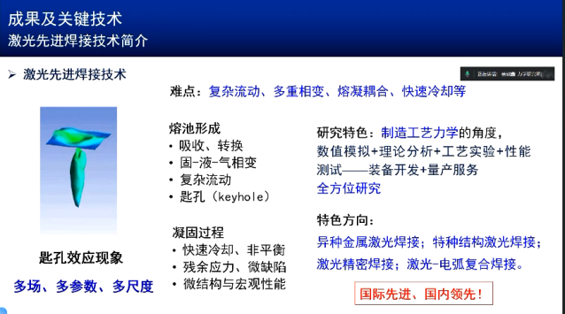 中国科学院力学研究所研究员虞钢展示的成果《激光先进焊接技术及产业化》,该技术的特点为高能量、高精度、高效率、低变形、无接触、绿色制造。难点:复杂流动、多重相变、熔凝耦合、快速冷却等;应用领域为装甲车动力系统的增压装置、航空陀罗马达的小部件、超薄承压件的激光焊接、火车座椅弹射器下的动力装置、高铁车厢的组装,采用了激光焊接技术,在无氧环境下进行激光制造,以满足不同客户的需求。