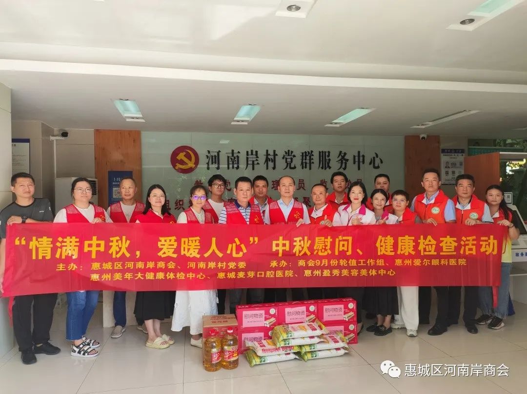 2023年9月27日下午,在中秋佳节来临之际,惠州市惠城区河南岸商会在河南岸街道办的支持下在河南岸村举办“情满中秋,爱暖人心”中秋慰问、健康检查活动。本次活动由惠州市惠城区河南岸商会、河南岸村党委主办,商会9月份轮值工作组、惠州爱尔眼科医院惠州美年大健康体检中心、惠城麦芽口腔医院、惠州盈秀美容美体中心承办。本次活动旨在增强村民的健康意识,为他们提供专业的医疗服务和健康指导,同时也让贫困家庭感受党的关怀和社会的温暖。