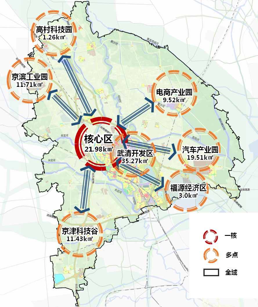划定“京津塘高速—南东线—武静线—龙凤河故道—龙凤河”合围区域城镇开发边界范围内约21.98平方公里为核心区,可开发空间面积约12.25平方公里,分期规划建设核心先导区、拓展区。