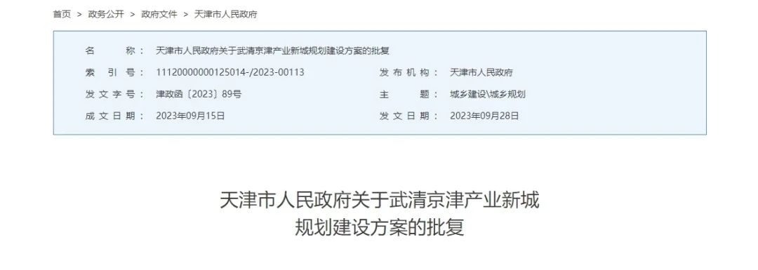 你区关于报审武清京津产业新城规划建设方案的请示收悉。经研究,现批复如下: