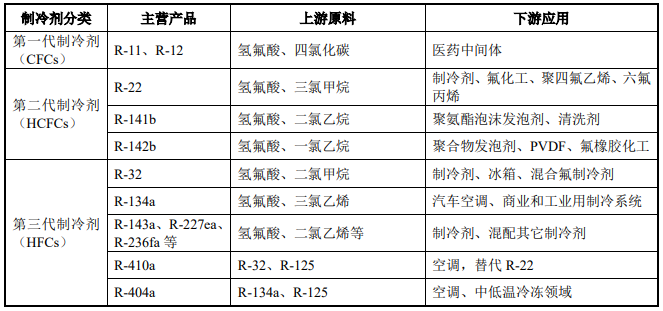 制冷剂是指热机中用于帮助实现能量转化的媒介物质,主要用于空调、冰箱 等领域。从需求结构看,固定式空调(包括家用与商用)使用制冷剂最为广泛,且制冷功率通常较大;相比之下,冰箱主要功能是保温且功率较小,单台冰箱的制冷剂消耗量相对小于固定式空调。对比车用空调,其在数量上小于家用与商用空调, 因此固定式空调在制冷剂消费中占据主导地位。目前在全球范围内广泛使用的制冷剂主要是第三代制冷剂 (HFCs),而第四代制冷剂(HFOs)尚未广泛使用。