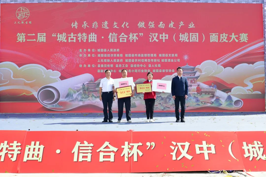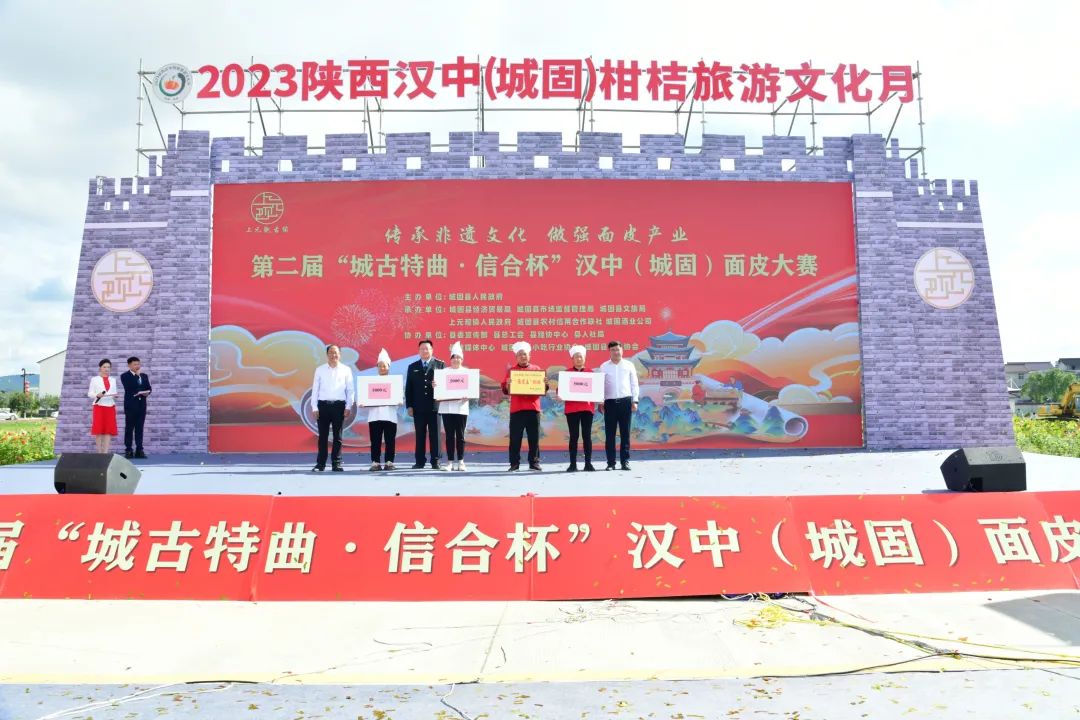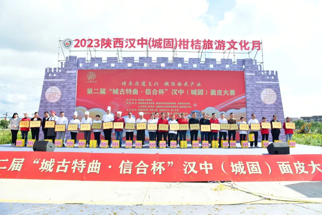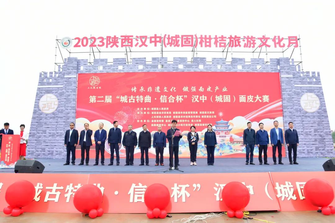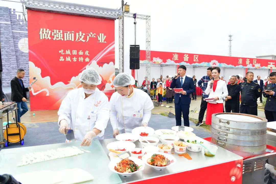 9月29日,第二届汉中(城固)面皮大赛在上元观古镇火热启动。大赛由城固县人民政府主办,县经贸局、县市场监管局、县文旅局、上元观镇人民政府、县农村信用合作联社、城固酒业公司承办,县委宣传部、县总工会、县经协中心、县人社局、县融媒体中心、城固县名小吃行业协会、城固县餐饮协会协办。汉中市政协常委、市文化和旅游局党组书记、局长徐红菊,汉中市市场监督管理局四级调研员刘艾庆,汉中市商务局党组成员、副局长张建军,县人大常委会主任肖万朋,县委常委、宣传部部长田海燕,县人大常委会副主任汪纪明,县政府党组成员、副县长陈超,县政府党组成员、副县长孙建,县政协常委鲁志军,陕西省城固酒业股份有限公司党委书记、副总经理何卫红,城固县农村信用合作联社副主任鄢晓鹏等出席大赛。孙建进行致辞。本次大赛的主题为“传承非遗文化 做强面皮产业”,来自城固县各镇(街道)的36支参赛队伍摩拳擦掌、跃跃欲试,个个都拿出了看家本领,进行激烈角逐。参赛选手们行云流水、井然有序,有的调制米浆、配制油辣子,有的蒸面皮、切面皮,再配上黄豆芽、芹菜、菠菜、胡萝卜丝等时令小菜做铺垫,顷刻间,一碗碗热气腾腾、色香味俱全的面皮便出锅了。尽管秋雨连绵,也依然无法阻挡人们对美食的热爱,Q弹软糯的面皮、花样繁多的特色美食吸引了众多游客前来品尝。