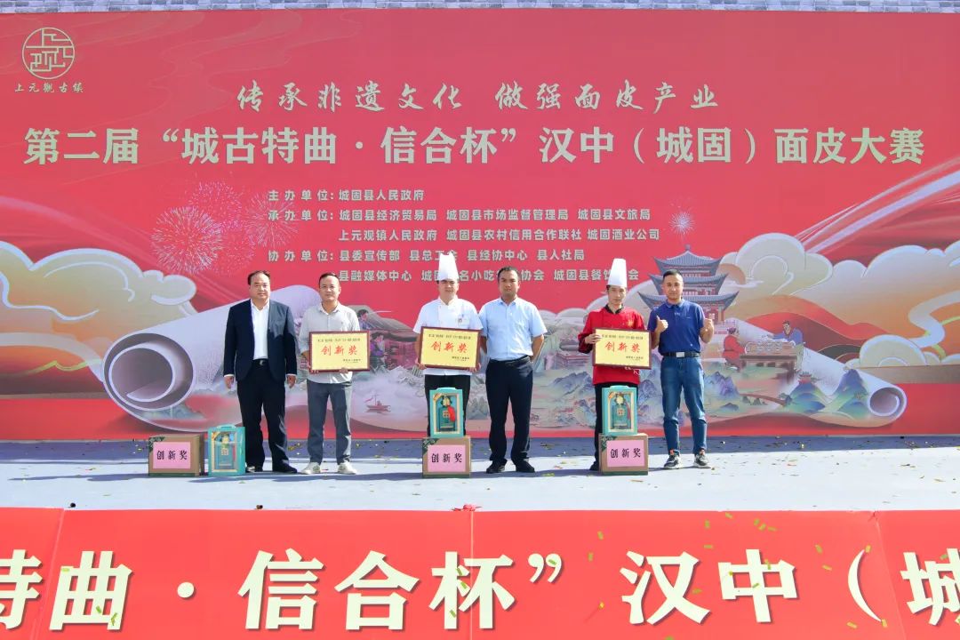 最终,通过合议评分的方式,城固县上元观付家叁玫叁面皮荣获本届面皮大赛金奖,城固精味王面皮、刘菲面皮店荣获银奖,城固县沙河营镇雪红小吃店、雷雪梅小吃店、吴军特色小吃荣获铜奖,城固县淘陶居、东方大酒店、万豪餐饮上元观分公司获创新奖。(金奖)