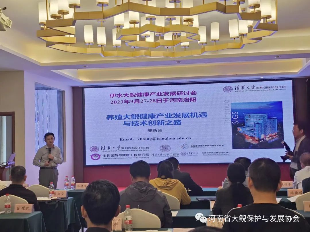 研讨会由洛阳市农业农村局党组成员、市农业技术推广服务中心主任阮祥鸣致欢迎词。原农业农村部长江流域渔政监督管理办公室主任、中国野生动物保护协会水生野生动物保护分会会长李彦亮,清华大学深圳国际研究生院杰出实践教授、国医大师李锡涛致贺词。协会名誉会长、清华大学深圳国际研究生院生物医药与健康工程研究院教授、主持工作副院长邢新会,作“中国特色大鲵健康产业技术创新机遇与挑战”主题报告。深圳市市场监督管理局二级调研员肖宇以“携手深圳国际食品谷,奋力推进伊水大鲵健康产业高质量发展”为题;陕西理工大学食品科学教授陈德经以“大鲵肝肽制备与护肝解酒作用研究”为题;吉首大学大鲵资源保护与综合利用湖南省工程实验室教授、主任罗庆华以“张家界市大鲵产业建设发展规划”为题;陕西省大鲵产业技术创新战略联盟理事长、汉中市大鲵产业协会会长程虎以“汉中市大鲵产业发展现状与发展方向”为题;协会副会长、河南师范大学水产学院教授乔志刚以“伊水大鲵资源增殖与保护”为题;协会秘书长、河南科技大学食品与生物工程学院教授任国艳以“养殖大鲵加工现状与发展趋势”为题;协会会长王松军以“伊水大鲵健康产业集群实施方案”为题,分别作报告,获得热烈反响。