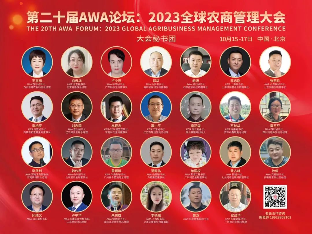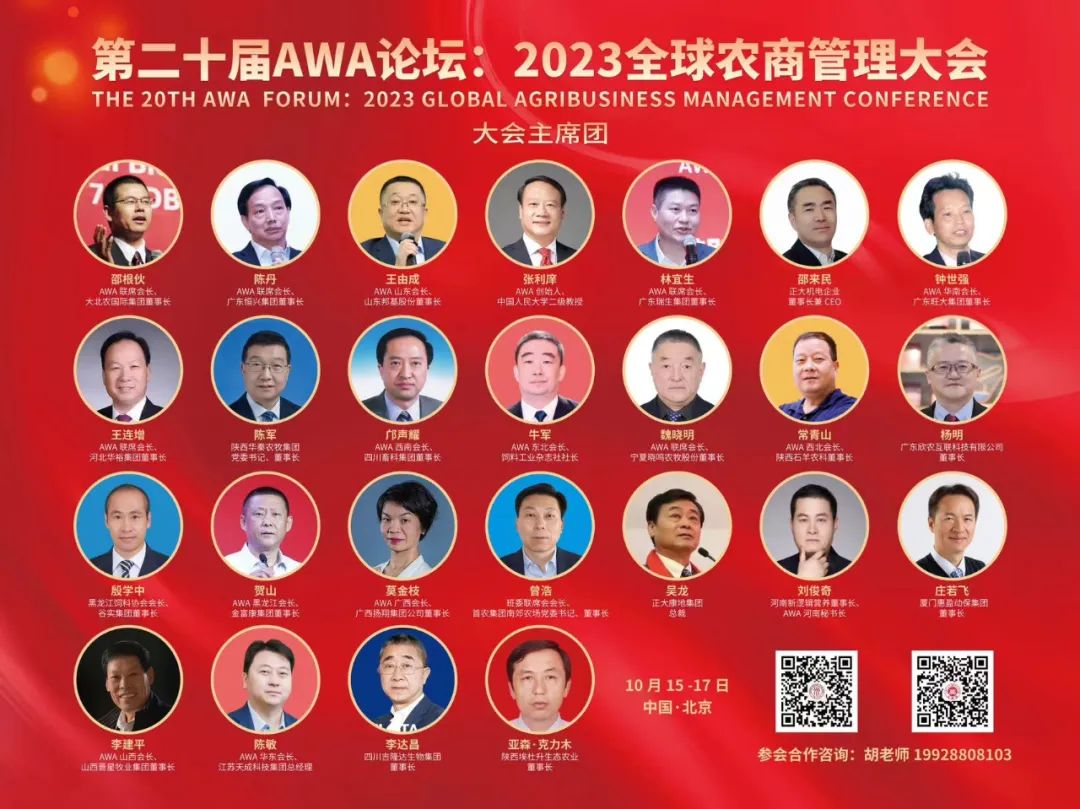 AWA(Agribusiness Winners Alliance)是“大赢家全球农商联盟”的英文缩写,是由中国人民大学中国畜牧饲料产业研究中心、国家农产品价格调控重大课题组、教育部乡村振兴重大课题课题组、国家民族地区乡村振兴重点课题组、中国人民大学农商管理科研团队、中国农业技术经济学会农商管理专业委员会与正大集团、大北农集团、温氏集团、恒兴集团、新希望集团、通威集团、亚太中慧集团、邦基集团、瑞生集团、傲农集团、安佑集团、旺大集团、扬翔集团、旭瑞集团、山东诸城外贸等国内优秀农商企业和国际Agribusiness管理学会共同发起的群众性平台组织,口号是AWA、AWA,英姿勃发、振兴中华;大赢家、大家赢!工作是引领农商学科,提升农商管理,培育农商人才,服务农商发展。使命是:聚集能量、发展农商、播撒希望!目前AWA大赢家论坛已经成功举办十九届,2023年10月15-17日将在北京举办第20届,主题是凤凰涅槃、浴火重生——文化、机制、模式。