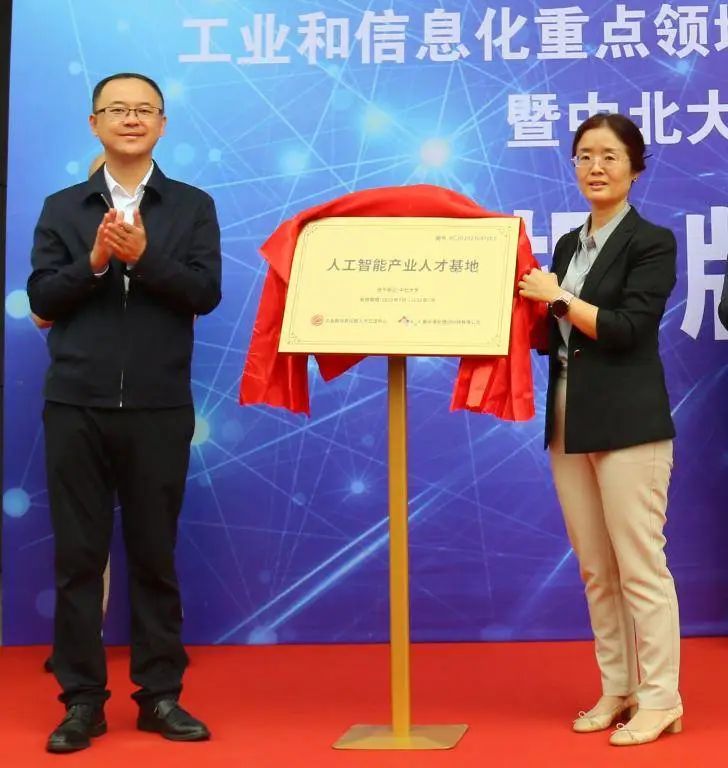 工业和信息化部人才交流中心教育培训处处长曲来军、 山西省工业和信息化厅技术创新处副处长张莉娜与我校副校长苏铁熊共同为(基地)学院揭牌。