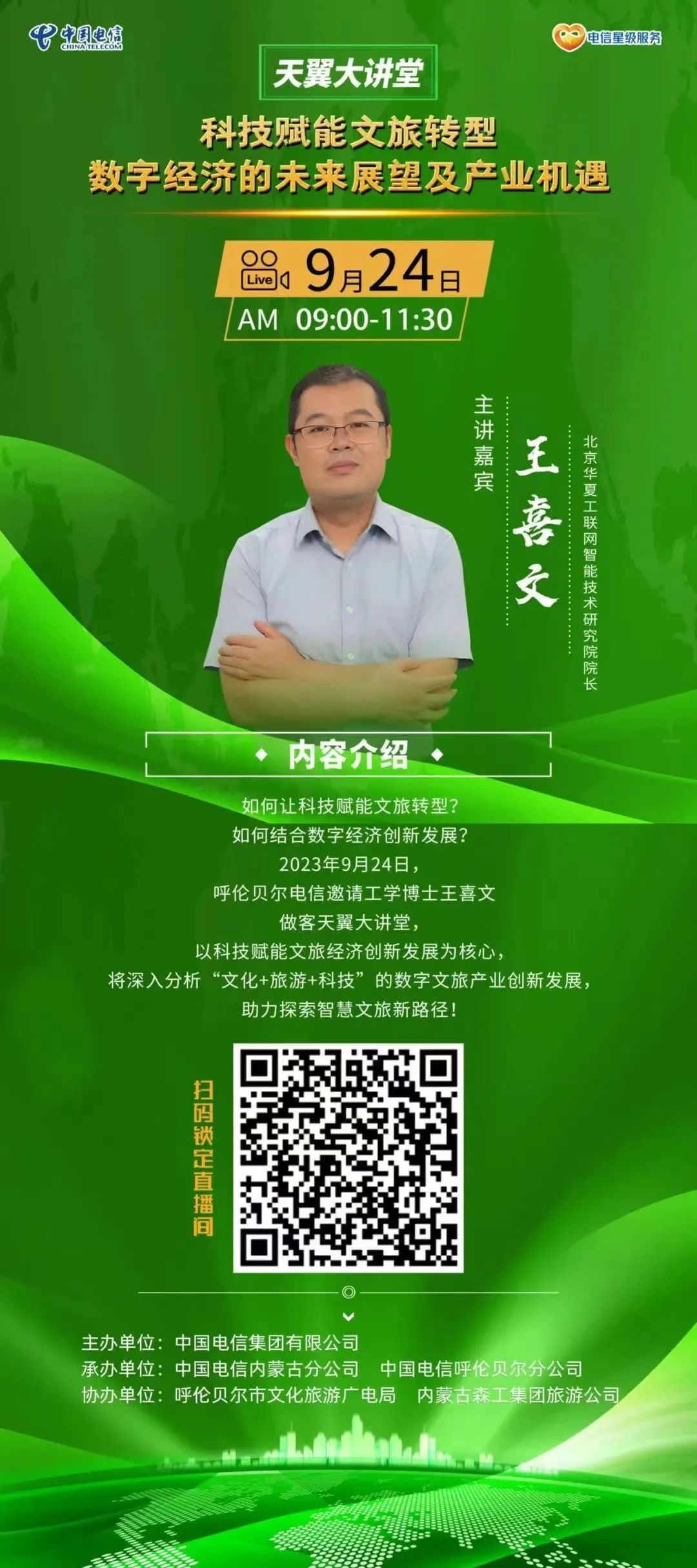 多彩呼伦贝尔,极致草原印象。2023年9月24日,中国电信天翼大讲堂《科技赋能文旅转型-数字经济的未来发展及产业机遇》在呼伦贝尔隆重举行。