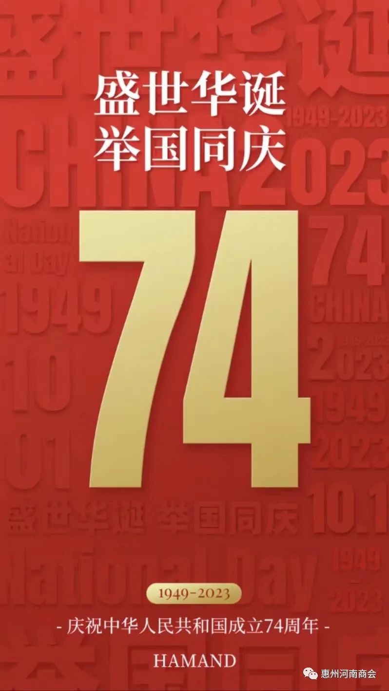在这个喜庆的时刻,我们迎来了中华人民共和国的生日——国庆节。在这个值得庆祝和骄傲的日子里,惠州市河南商会向长期大力支持商会工作和关心商会发展的全体会员家人、社会各界朋友致以最崇高的敬意和最热烈的祝福!祝大家国庆快乐、幸福安康!愿我们伟大的祖国国泰民安、繁荣昌盛!希望在新征程中,商会与您携手共进,在未来的发展中取得更加辉煌的成就,共同开创更加美好的未来!