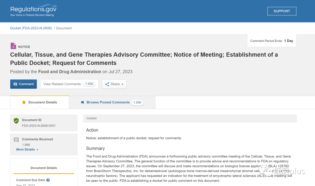2023年9月27日,美国FDA委员会对BrainStorm Therapeutics,Inc .关于debamestrocel(诱导分泌神经营养因子的自体骨髓间充质干细胞)的生物制剂许可申请(BLA)125782进行讨论并提出建议。申请人已经要求治疗肌萎缩性侧索硬化症(ALS)的适应症。会议对公众开放。美国FDA正在建立一个关于该文件的公众意见摘要。