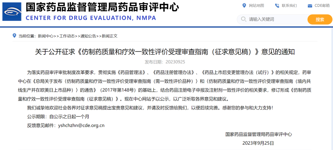 2023年9月25日,中国CDE发布了关于公开征求《仿制药质量和疗效一致性评价受理审查指南(征求意见稿)》意见的通知。