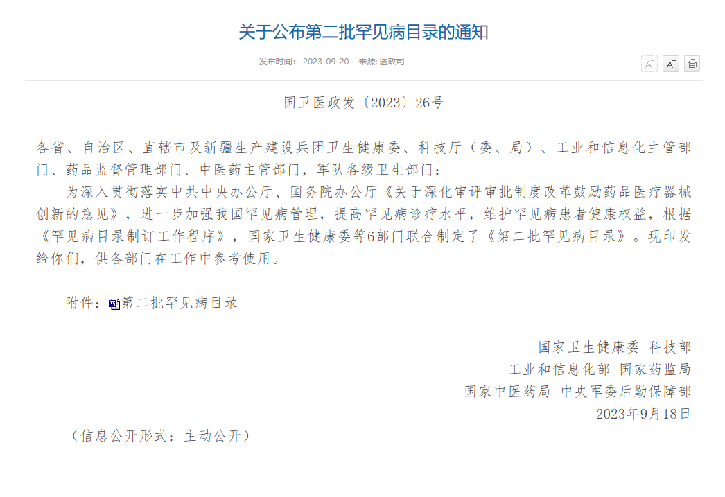 近日,国家卫健委、科学技术部、工业和信息化部、国家药品监督管理局、国家中医药管理局和中央军委后勤保障部等六部门联合发布《第二批罕见病目录》,共纳入86种罕见疾病。至此,我国现有207种疾病已正式被纳入国家罕见病目录中。