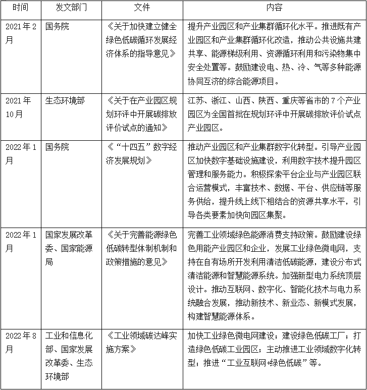 近三年来,政府多部门发文均有提及针对工业园区节能减排工作指导意见,要求提升工业园区能源利用效率,加快园区能源数字基础设施建设,利用数字技术构建智慧能源体系,打造绿色低碳型工业园区。