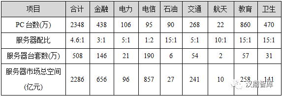 (1)按照PC与服务器配比4.6:1的假设,金融、电信、石油电力、交通、航空航天、教育、医疗八大行业PC整机总空间2,348万台所需服务器508万台,含软硬件市场总空间2,286亿元。