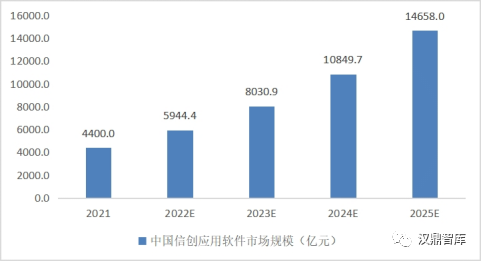 2022年中国信创应用软件市场规模为5,944.4亿元,近五年复合增长率为35.1%,在五类信创产品中增速排名第二。